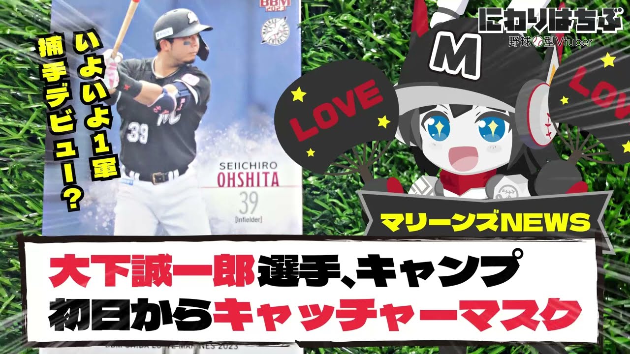 ロッテ大下聖一郎選手キャンプ初日から ブルペンでキャッチャーマスクをかぶる皆 さんこんにちはロッテ大好きvtuber 2割8部ですえ本日のキャンプ初日なん ですけれどもいきなりね大下選手が ブルペンでマスクをかるということでま 今日はね高野投手らの球を受けていたと いうニュースが入ってきましたま大下 聖一郎選手は去年の7月12日にの イースタン戦でもキャッチャーでマスクを かぶっていたんですけれどもまあねその いわゆる第3保守というかそのねもうその 緊急事態に備えてキャッチャーの練習をし ているっていうことはニュースでは去年 あったんですけれどもま残念ながらね一軍 でそのキャッチャーの姿を見 るっていうことはなかったんですけれども いやいきなり2024年のキャンプ初日 からキャッチャーの練習をしているという ことはまだからその去年のあれっていうの はその一時的な思いつきではなくてま中 長期的な戦術の1つキャッチャー大下 たっていうのはまだからね戦略の1つとし て今後使用される可能性が非常に高いと いうことが分かってきましたねま大下選手 もね去年はそのベンチでの声出しとか ムードメーカーっていう形ではすごいその チームに貢献してくれたんですけれどもま ちょっとねその出番というか打席や守備 機会っていうのはやっぱりちょっと少なめ でしたのでまそれで言うとその キャッチャーができるっていうことはその 本人にとっても大きなオプションになると いうかまアピールポイントになると思うん でまちょっとねこれはもしかしたらそのね 練習試合とかオープン戦でいきなり キャッチャー大下が見れるかもしれません からちょっとこれは注目していきたいです ねまやっぱりねロッテもねキャッチャーは その田村選手佐藤選手松川選手まあと柿沼 選手っていうところで去年は主に4人で 回してたんですけれどもまねあの上田選手 も何試合か出ましたけどまあね キャッチャーその中でね大下選手がどう いう風にアピールしていくのかまそれこそ ねその試合終盤というか延長に入ったらね キャッチャー大下が見れる可能性っていう のが今年あるかもしれないのでまちょっと ね今日はねこの選手キャッチャーに ブルペンでマスクを被るっていうニュース をお届けしましたねこれからが非常に 楽しみですはいというわけでえ今日は以上 ですよろしければチャンネル登録よろしく お願いし ます