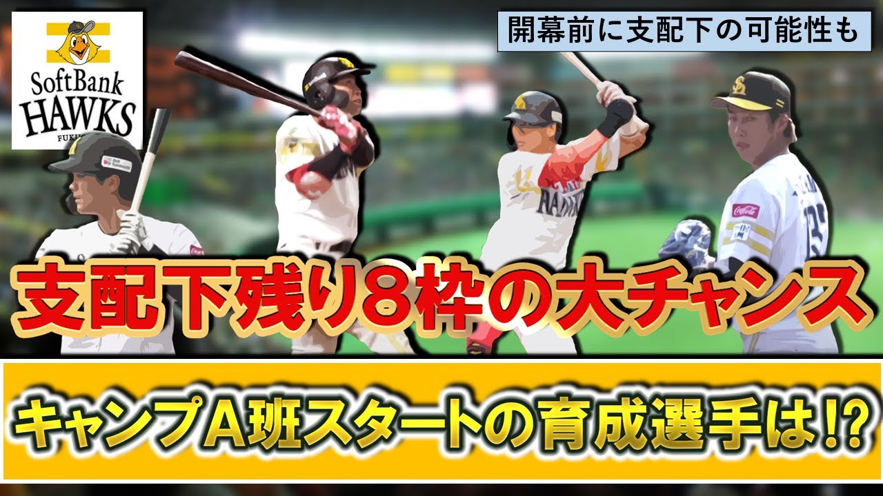 の8アダレホーマオーベスが0.389と グッとね数字を落としてしまいましたま ただこの後のフェニックスリーグで しっかりと結果を残していたっていう ところもあったんで一度契約が切れて しまう3年目でございましたが今期の契約 を結んでいたということになっております でま彼に関しては昨年の不調をね 吹き飛ばさアピールっていうところをして ほしいなという風に思いますしま去年ね 全然2軍でダメだったとはいえ今年まAハ にね選ばれているっていうところはま 間違いなく期待されている証しでござい ますしこうフェニックスリーグのね活躍 っていうのも評価されているのかなって いう風に思いますまポジション的にはね 長田選手を被るっていうところはあるん ですがこうユーティリティとしてもね計算 はできますしそこの争いっていうところ要 注目ですよねはいというわけでA反に呼ば れた育成選手4選手見ていきましたが最後 さとまとめて終わり ましょうはいではまとめていきましょう 今日見ていったのは中村亮太選手川村優 選手中田啓介選手そして大方陸選手の4 選手ということになっておりますまこの4 人がねサ選手の中では1軍A反に瞬 キャンプメンバーいりということになって おりますでソフトバンクの試合が人数って いうところも見ていきますと現在 ピッチャーが32キャッチャーが8ナヤが 13ガイアが9でK62ということになっ ておりますまあまあこうやって見ていくと ねやはり枠っていうのはあと8枠空いて おりますままだねスケットが5選手しかい ませんのでまそこをもうちょっと増やして くると考えてもね7枠から6枠は空いて いる状態でございますそう考えたらやっぱ 例年よりはめちゃくちゃ上がりやすいかな という風に思いますしま育成選手57人と 非常に多いんですがその中でも選ばれた4 選手でございますでこうやって見ていくと やっぱキャッチャー以外はねそこまで デプス埋まっていないっていう感じもあり ますしまもちろんピッチャーちゃのね中村 選手もそうなんですがま野手の3人もね センターラインを守ることができ るっていうところもありますんでま全然ね 昇格の可能性はあるんじゃないかなという 風に思いますでソフトバンクに関しては もちろんね彼ら以外の選手っていうところ も期待できる選手はいますし当然こう ルーキのね選手の昇格っていうのもあるか もしれませんまあまあそういった中でまず こうチャンスを与えられたっていうところ
