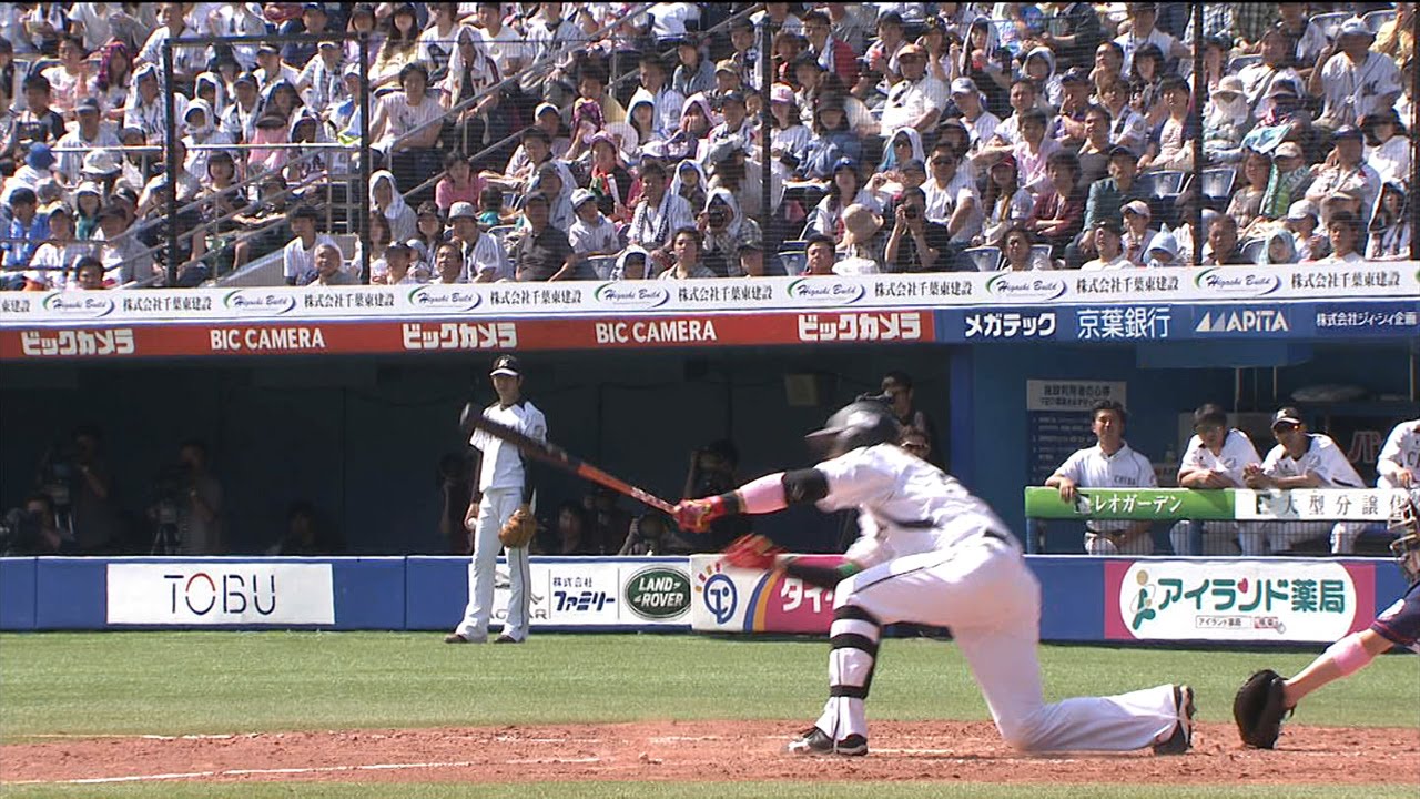 3回、大嶺翔が低めの球をしぶとくレフト前へ。タイムリーで先発の兄・祐太を援護した。 (5月10日 ロッテ-埼玉西武)