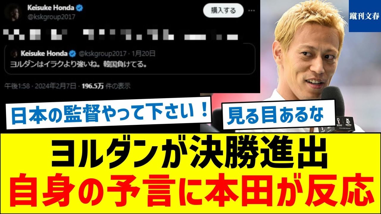 [音楽] ヨルダが決勝進出地震の予言に本田が 反応1月20日のグループリーグでも対戦 し2対2の引き分けこの試合中本田は自身 のXでヨダはイラより強いね韓国負けてる と投稿決勝トーナメント1回戦でヨダが イラクに勝った時にもクローズアップされ ファンから的中しましたねなどと指摘され ていたそして今回夜韓国撃派本田派なのか 過去の地震の投稿を引用する形で当たっ ちゃったかでも適当じゃないからね エプイとった本田監督にしろ本田さんが そうか知らんけど本当にワールドカップで 上を目指してる人に監督になってほしい あれじゃもう選手ついてこないよというか 本田て選手引退してたっけてSQ ライセンス持ちではないのに代表の監督に なってたよな本田さんも代表の監督には なれるとちゃうの選手熱い日本だしホダに やらせてほしいホダライセンス性に反対し てるのか勉強できないのかな 笑本田監督なら優勝してた な A