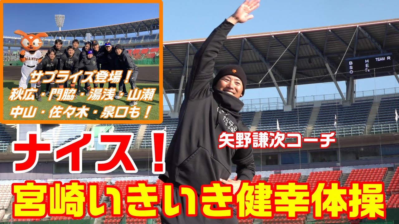 ひなたサンマリンスタジアム宮崎で12日、「宮崎市×読売ジャイアンツ『キャンプ地の芝生の上で 宮崎いきいき健幸体操』」と題したイベントが開かれ、約750人が早朝のグラウンドで体を動かしました。
