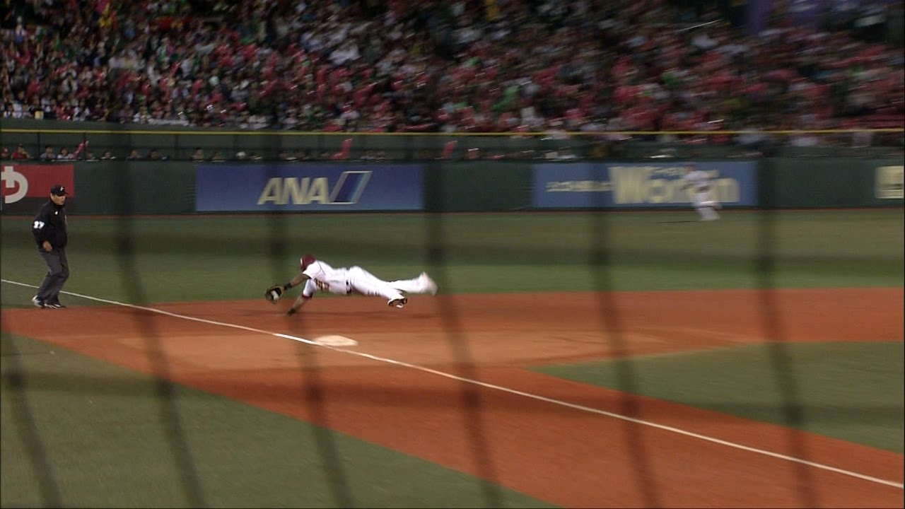 7回、三塁線の打球をウィーラーが好捕しアウトに仕留める。飛びつきながらも難しいバウンドにきっちりグラブを合わせた好プレーだった。 (8月29日 楽天-埼玉西武)
