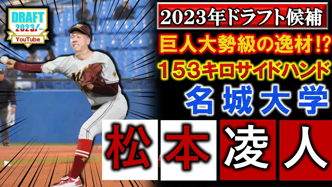 なっていうふうに思いますし 開け次第ではまあ1名もね当然狙える選手 かなというふうには思いますので 注目選手の一人であることは間違いないの かなっていう風に思いますまあこう能力の 高い選手ですしこの春ダメだったところを ねしっかり秋に修正してくる力はあるん じゃないかなというふうには思いますので そういうところも含めてちょっとねどう いうピッチングしてくれるか最後の 追い上げに行きたいかなというところでは ないでしょうかはいというわけで以上成績 でございましたそれでスカウトコメントの 方もチェックしていきましょう はいではスカウトコメントですねチェック していきましょうまずは楽天のスカート ですねボールの強さ変化球の精度が上がっ て成長を感じる上位候補に入るDNAの スカウティングディレクターはボールの 問いがハートも強い抑えても先発でもでき そう広島のスカウトもドラフト1候補に 入ってくるかどうかということで ハイマンドのスカウトもねやはり高評価は 高いのかなっていうふうには思いますし 上位候補1位候補に入ってくる可能性が あるというね見方をしているスカートが 多いのかなっていう風に感じますでまだ あります見ていきましょう はい中日のスカウトはあの馬力は 武器 請求も良くなっていますで巨人のスカウト もパワー型で馬力がある変速でとても魅力 的ですねということでございますはいと いうことで以上で5球団がコメント現在 出しているということでございますがまあ 当然それ以外の球団もね注目しているか なっていう風には思いますのでまあ今後ね 秋のリーグに向けてどんどんコメントも 増えてくるんじゃないかなっていうふうに は感じますがはいというわけで今日は以上 でございます最後ねさっとまとめて終わり ましょう はいどうもまとめていきましょう今日見て いったのは松本亮太選手名城大の ピッチャーです最速153km変速波1と いうことで非常にこう速い球を投げるです ねサイドハンドのピッチャーということに なっておりますまあやっぱねこうサイド 反応の選手っていうところでまあ今こう トレンドになっているみたいなところも ありますのでそういう意味でもかなりね 注目の選手かなというふうには感じますが では今期不調ということでございまして今 までしっかり成績残してきていたんです けどまあこの
