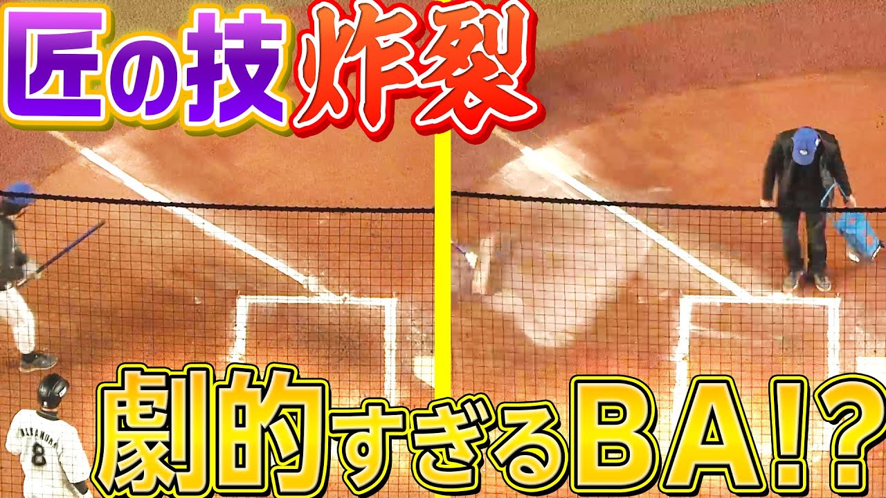 匠は白線を一体何に使うつもりなのでしょう?……使い勝手の悪かった少々曲がった白線が、みんなが納得の白線に大変身! なんということでしょう。白線が、正しいルートを示す白線に生まれ変わりました。これでもう、白線が曲がる心配はありません!生まれ変わった白線を見に、中村奨吾が50秒ぶりに打席を訪れました。