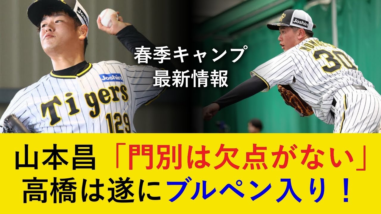 今回の動画ではタイガースの春期キャンプ 最新情報として山本正が門別選手を絶賛し た件についてそして高橋春と選手がついに ブルペン入りした件について紹介していき ます是非最後までご覧くださいなおこの チャンネルは熱狂的な阪神ファンによる 阪神だけに特化したチャンネルになり阪神 に関連しない動画は一切投稿しませんその ため阪神ファンでチャンネル登録がまだの 方は是非チャンネル登録をお願いいたし ますまずは門別選手から見ていきましょう 昨年の周期キャンプで岡田監督が絶賛し 大きな注目を集めている門別選手は キャンプ初日からブルペン入り平均急速が 145kmを超えるなど順調な仕上がりを 感じさせましたピッチングを見守った岡田 監督も一越して自分なりに自主トレもやっ てきたなという感じもするし11月と比べ ても全然ね2か月間ほとんどピッチングも してないわけだからねでも全然遜色ないと 語り絶賛のコメントを残した昨年秋と 変わらない高い評価をしているようです2 日にはタイガースのキャンプを訪れた サムイジャパンの居監督から新しく見てみ たい選手として名前をあげられ体もまた 一回り大きくなった昨年からボールは 素晴らしいと思っている見てみたいとラブ コールを送られる場面もまだ1軍での勝利 がないものの注目度は日日日に高まってい ます2月4日は同じサウスポーで通算 219勝を記録したレジェンド山本正が タイガースのキャンプを訪問ストレートに 加えてカーブや通シームといった変化球を 解禁した門別選手のピッチング練習を 見守ると僕より全然球が早いですし フォームのバランスもいいしもっとも体が できてくると弾も走るでしょうし十分じゃ ないかなと思いますとコメント続けて本当 に欠点がないもっともっとボールが走る ようになるんじゃないかと思うそうなっ たらおそらく先発ローテーションに入っ てるんじゃないかなと思いますと開幕 ローテーション入りに太鼓版を押しました キャンプ初日からブルペン入りを重ね順調 に調整を進めている印象の門別選手中でも 高い評価を受けているのが力感のない フォームから繰り出すキレのあるボール です門別選手自身がこのフォームからこの 玉が来るのかと思わせる玉を投げたいと 理想を掲げておりソフトバンクや巨人で 活躍した杉内選手のようにフォーム以上に キレのあるボールを投げ込みたいと考えて いるようですキャンプ初日にボールを受け た梅の選手がゆったりとしたフォームから ピュッと出てきて本当に玉のスピードを