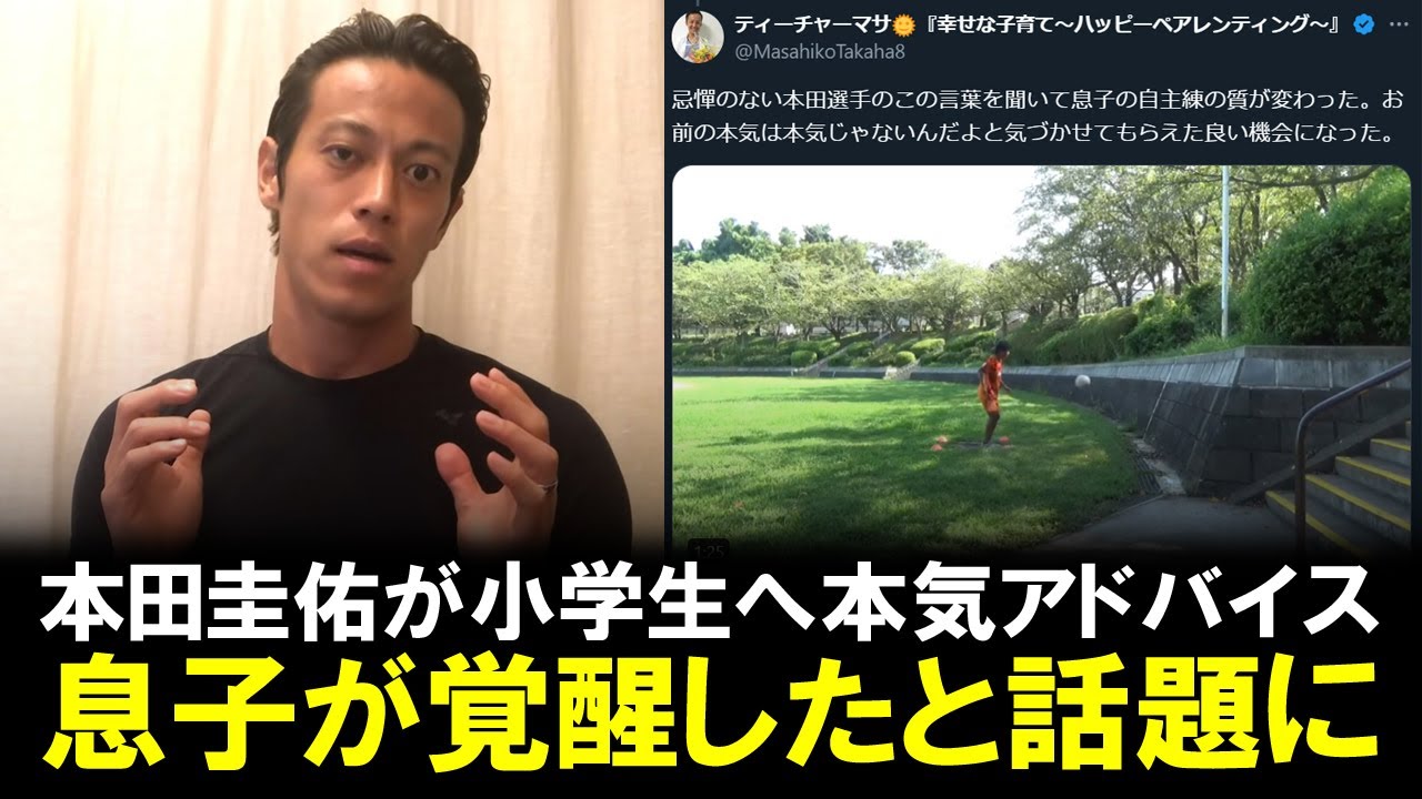 本田啓介が小学生へ本気アドバイス息子が 覚醒したと話題 に数年前本田啓介選手に小中学生数名が ZOOMで質問できる機会があって息子も 参加させてもらったんだけどある小学校高 学年くらいの子が僕はプロになりたいから もっとサッカーの練習がしたいんだけど親 が塾に行かせようとしていますどうすれば 良いと思いますかと質問したら君の親は君 がプロになれると思ってないから勉強し とけと言ってるんだよこいつならプロに なるだろうと思えばサッカーもやれって 言うよ君の行動がプロになれるように見え ないんだと思うよ君はちょっとでも時間が できたらすぐボールを蹴ったり体感やっ たりプロになるためのことをやってる的な ことを言って小学生が何も言えなくなって しまったことがあったんだけど本当その 通りだと思う担のない本田選手のこの言葉 を聞いて息子の自主連の質が変わったお前 の本気は本気じゃないんだよと気づかせて もらえた良い機会になっ た正論すぎるこれくらいズバット以外の人 に言ってもらえるのいいよねグのもねこの 答えがすぐに出たということは昔から本気 でプロになるための行動をし続けてきたん だろうなと容易に想像できるこれ親が言っ ても伝わらないんだよね憧れの人からの 助言じゃないと本田選手に言ってもらえる この言葉本当価値ある親じゃダメなんだよ なプロの世界と同じ感覚でアドバイスして くれる優秀な大人にたくさん合わせること が親の指名だなって思った小学生だからと 手加減せずに正面から本気で向き合う本田 啓介人のせいじゃなくて自分のせいだと 自分で思って実践につなげるための フィードバック本田啓介さんは小さい頃 から夢に向かってたこういうその場しのぎ でない正しいことをきちんと言える大人 って素敵だと思う本田さん自身が子供の頃 から選手としてずば抜けた意識の高さを 持ってこられてきたかというのが伺えるお 話ですねこのレベルの人ばかりが集まり さらに古をかけられるのがプロの世界だよ ねどっちも頑張ればええやん とチャンネルはコネタやネット反応集の他 にもゆっくり解説動画でサッカー解説も やってますチャンネル登録高評価よろしく お願いしますコメントやいいね励みになり ますゆっっくりしていって ね