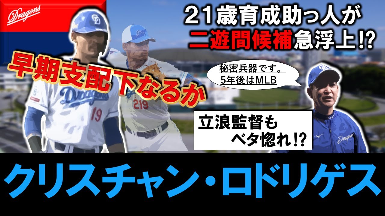 辺もね非常に勝っておりますでそういう ところもあってね2月の10日から1軍の 大外ジに呼ばれてまそのまま一軍に残留し ている状況でございますまなんでこう早く からタさんに目をつけられて上の方にね 呼ばれていたというところでございますで さらにですね1軍のシード打撃ここで しっかり結果出しておりましてま2月の 10日選手からツーベスで2月の13 小笠原選手からレフトライナーで2月の 16ここでもね高橋博選手から放って いたというところでございますでさらに2 月の17今日の練習試合では2塁打を2本 マークするなどしっかりと試合でも活躍し ておりましてまシート大と合わせて打撃面 でしっかりとアピールできていたという ことになっておりますまあまあやっぱ守備 力っていうところはノクとかでもねいい 動きを見せていたんですがま打つ方もね 結構いいんじゃないかというところになっ ておりますままなんでそれもあって評価が 高まっているという状況ではあるんですよ ねまでは実際このロドリゲス試合化の可能 性はあるのかっていうところその辺もねお 話していき ましょうはいでは試合がの可能性っていう ところでお話していきましょうままず中日 の試合がの二間構想っていうところま当然 ね2塁もショートを守れる選手っていうの もたくさんいるのでま全然わかんないん ですが今年のキャンプの動き見ていくとま セカンドは竜選手ま当然ねショを守れ るっていうところでございますがま去年は セカンドリクっていう構想をね達さんは 言っておりましたで高橋平選手ま彼もね このキャンプセカンドでプレイしており ますで田選手がケアから復帰まだ守備には ついておりませんが試合に出るのは セカンドというところになっておりますで あたま樋選手や石垣選手らもねい るっていうところでございますからまこの 辺はそこそこ上がってくるとでシに関して は村松選手ま彼がね結構試合に出ている 印象でございますま今日ちょっとねあって 怪我の心配もあったんですがまどうやら 大丈夫でございましたでま彼の場合はね ショートセカンドまどっちもねでき るっていうところもございますんで何とも 言えないところでございますがまあまあで もね当初の構想はシトでまルーキーの辻本 選手そしてま津田選手らがおりますがま 津田選手はちょっと怪我をして離脱して おりますまでも継承みたいですねで阪神 から加入してきた山本選手もおりますま彼 もねユティリティとして期待ができる選手
