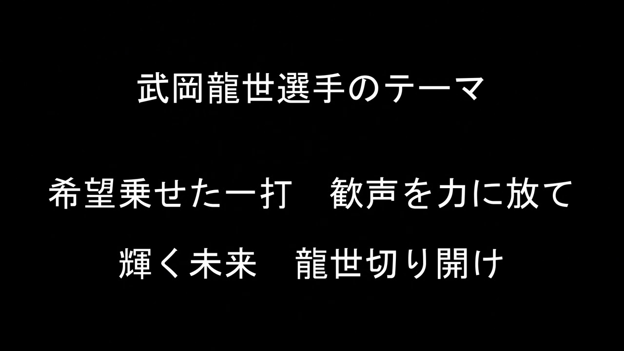 東京ヤクルトスワローズ武岡龍世選手のテーマです。 希望乗せた一打 歓声を力に放て 輝く未来 龍世切り開け 企画・制作 全国ツバメ軍団 [音楽] にて だせよ希望をせた 色力に 未開 [音楽] た Tokyo Yakult Swallows東京ヤクルトスワローズ武岡龍世 NPBHUB.COM | The Fanbase of Nippon Baseball & Nippon Professional Baseball
