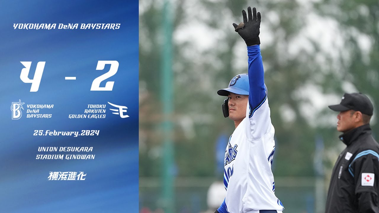 それではユニオンデスからスタジアムギノ 1で行われましたイーグルズと ベイスターズのオープン戦ハイライトで 振り返りましょうベイスターズの先発平 立ち上がりこの山田に大きなレフトフライ 打たれましたがレフト佐野が掴んでいます 風が右から左強い風が吹いていました辰 三振で3者本体のスタートという平 です2回の裏ベイスターズの攻撃 レスターズ先発ピッチャー滝からこの大和 が緩いカーブで三振そして伊藤光アウト コースのストレート見逃し三振で連続三振 ということでえ2回まで得点上げることは できません3回の表イーグルスは2アウト 2塁山田平のスライダーバットが届く ところに行ってセンター前タイムリー ヒット1点を先行し ますは回47球1点という投球でし た4回の裏ピッチャーが小者ということに なって佐野がヒットを放った後マが 三振ルーキードラフト1位のこじです5回 小者は先頭バッターにフォアボールを与え てから1アウト1塁3塁そして 西巻コンパクトな構からセンターへ きっちりと犠牲フライ3塁ランナー がホームに帰りまして同点1対1となって い ますそしてこの回2アウト1塁で渡に打席 が回って渡がファーストの左をるライト前 のヒットオープン戦8ヒットを放ちました 渡今日は1番ライトで出場していいありの ライトライナーもあったんですが3打数1 安打という渡でした6回裏ベースターズ2 アウト1塁3塁でバッター柱つまりながら セカンドキャンバスの横石上の足がまさり まして記録ナイアンだまノーアウト1塁3 塁で連続三振2アウトですからこの チャンスを逃すと嫌な感じだったんですが 2対1勝ち越しさらに林センター左へ タイムリーヒット2塁から石上がホームに 帰りまして3対1と2アウトからいい流れ の攻撃を見せまし た7回の表イーグルスこの回から ピッチャー小になっています 先頭バッターにベースを許してバッター 石原石原も 中センターへタイムリーヒットということ で1点を返して3対2この後満塁まで連打 でピンチを広げたんですが小の踏ん張り ました7階の裏は本 から立が3ベースを打ってそして楠本が 初球をライトへタイムリーヒット4対2と リードを広げますゲームは9回の表小園が 2アウトからヒットを許しましたが最後は 平をセカンドフライに打ち取ってゲーム