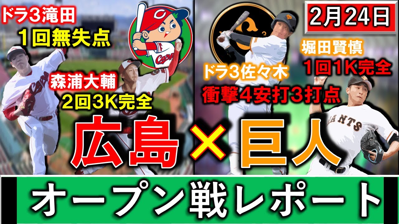 はいプレイボールども野球人です2月24 日広島巨人オープン戦レポートということ でございましてはい今日ですね広島と巨人 のオープン戦が行われておりますま共に オープン戦2戦目ということになりますま 昨日はね巨人9点広島が10点取ってまま 共に解消した試合でございましたでそれを 踏まえて今日ねどういう試合をするかって いうところを注目でございますがではまず オーダーから見ていき ましょうはいでは2月24日オープン戦 ですね見ていきましょうまずは広島の オーダーは1番セカンド菊2番サード田中 3番ファースト東林4番指名たし シャイナー5番ショート小園6番ライト 田村7番レフト中村高弘8番キャッチャー 石原9番センターに久保そして先発がハチ ということになっておりますはいま広島の オーダーとしてはまま今日セカンドで菊 選手が入っておりますま昨日はね出てい なかったんですがまオープン戦初場という ことになっておりますで先発はハチですね スの選手でございましてま先発としてもね 考えられるというところではあるんでどの ぐらいやれるかってところが楽しみですよ ね一方巨人は1番ライト松原2番センター 岡3番ショート角4番ファースト岡本5番 キャッチャー大城6番セカンド吉川7番 指田佐々木8番サード出口9番レフト ハゲ男という大台になっておりますはい まま巨人はね1番から4番までは昨日と 同じオダで5番に昨日は吉川が入っていた んですが大城が入って6番に吉川で7番に ルーキーの佐々木8番に出口という並びで ございますで先発はですね菅野という ところですねまやっぱねバリバリ実績持っ てる選手でございますしま当然開幕ローテ はね入ってくるだろうっていうところで ございますが今はねどのくらいの状態なの かっていうところ楽しみでございますかで 系統見ていきますと広島はハチ斎藤森浦 矢崎島内滝田と繋いでいってで巨人は菅野 グリフィン畑ほった泉ババ船様田中という 系統になっております巨人は2回3回7回 に点を取って10点広島3回に1点という ところでございましてま今日はね10対1 で巨人の勝利ということになっております はいそれではねり軍打撃成績見ていき ましょうはいではまず巨人のね成績見て いきましょう今日は1番に入った松原選手 4打数の1安打2打点13振ということに なっておりますま今日はね犠牲フライなど もあってしっかりと打点を稼いでおります ま連日ねアピールがついておりますが今日 も悪くはなかったんではないでしょうかで