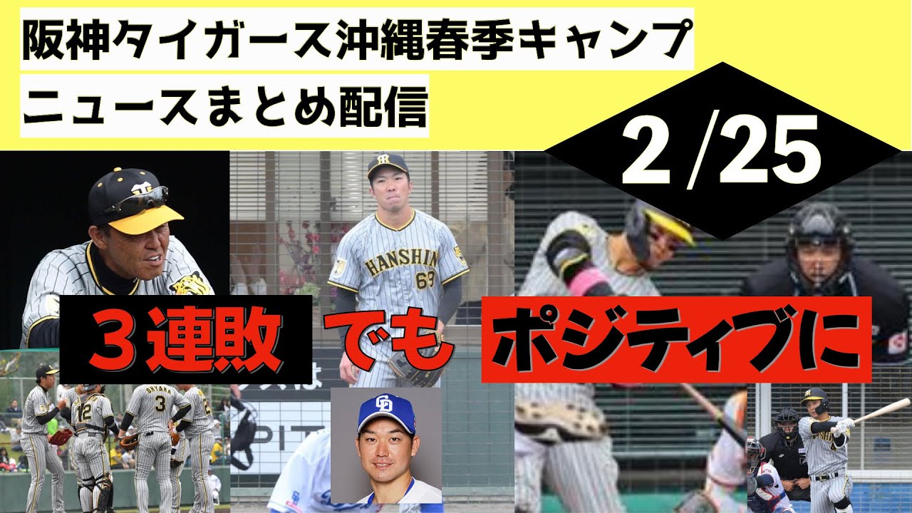 こんにちは大輔ですトコヤチャンネルへ ようこそいつもトラヤチャンネルをご視聴 いただきありがとうございます今日も阪神 タイガース沖縄春期キャンプニュース まとめ配信行ってみましょう本日2月25 日日曜日第5クールの4日目です2月23 日金曜日からオープン戦が始まり近道日と 3連戦いやオープン戦ですけれどもね3 連休3連敗はなかなかきついですねいや それでもねもちろんいいとこともありまし たので日韓スポーツさんとデイリーさんの 記事をね元に試合を振り返っていき ましょう最後に私の感想などもお伝え できればと思いますそれでは行ってみ ましょうはい2月23日那覇で行われた 巨人戦先発メンバーはねえこちらにあり ます通りでございますえほぼ主力のねえ メンバーを先発に置いてえ登板は伊藤正 投手え鍛冶投手石井投手浜投手岩投手霧 投手という順番でございました結果はね 残念ながら9対4で巨人の勝ちとなりまし たがねそれでは記事を元に振り返ってみ ましょう阪神は序盤の失点が響きシーズン 開幕戦の前哨戦となる対巨人のオープン戦 初戦を勝利で飾れなかった先発の伊藤正 投手が初回巨人打線に7安打を浴びてえ プロ入り5事故ワーストとなるね7失点と なりましたえジャイアンツキラーがまさか の立ち上がりとなったとありますねしかし 打線は2回から反撃を開始2回2アウト ランナーなしからの3連打で1点を返しえ 3回には佐藤照明選手がオープン戦の1号 となるツラを決めたとあります巨人2番手 赤星の初球145kmのストレートを捉え 宇宙間に大飛球を運んだとありますね伊藤 正は2回以降本来の安定感をを取り戻しえ 2回3回はね完全投球で投げ終えたと旧 エンジンは7回に登板した岩月投手が先頭 から3連打を浴びるなどお4ワダを浴びて 2失点打線は昨年まで阪神に所属した ケラーなど巨人9エンジンの前に反撃を 阻まれたがま8回にはね代打のミセス選手 がオープン戦1号ソロで意を見せたとえ チームは宿敵巨人を相手に今春の大外試合 初黒星を期したとこの試合の後岩投手の 制裁を書いた投球内容にね岡田監督が激高 とありましてねえ岩投手は2軍落ちとなり ましたまたね帰りの車に乗る際に高田監督 が後部座席に帽子を叩きつけたなんてねえ 記事もございましてえま今シーズン岩投手 の復活がね最大の補強とも言っていた岡田 監督なのでま期待するからこそのこの激な のかなという風に感じますねま私はね初回 の7点がねなければま勝ってたでしょうと お都合よく解釈しておりますえ伊藤正投手