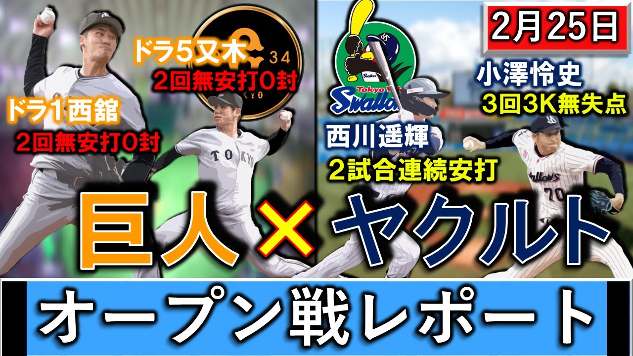 はいプレボールどうも野球人です2月25 日狂人ヤクルトオープン戦レポートという ことでございましてはい今日ね日曜日で ございますま各球団順調にこうオープン戦 ってところが住んでおりますがま今日はね 巨人とヤクルトのオープン戦の模様を 振り返っていきたいと思いますま巨人はね 昨日昨日と二桁アダで解消デアクルドは 昨日がねオープン戦初戦でございましたが 阪神を完封というところでまとにね負け なしで今日の試合ということになっており ますではまずオーダーの方見ていき ましょう はいで2月25日オープン戦ですね見て いきましょう巨人はですね1番小頭角2番 レフト長野3番サード坂本4番ファースト 岡本5番ライトに佐々木6番セカンド出口 7番締め出し大城8番キャッチャー岸田9 番センター松原先発が山崎伊ということに なっておりますはいま巨人はねベテランの 長の坂本ま彼らが今日オープン戦初場と いうことになっておりますで注目のね ルーキー2人ドラ3佐々木とドラ4出口は 5番6番でそれぞれ出ておりますで今日は ねセンター松原が入っているっていう ところここも注目ですよねでま先発は山崎 伊ま去年ね初めて来て乗ってま今シーズン さらなる飛躍をというところでございます がで一方ですねヤクルトに関しては1番 指出し西川2番セカンド竹岡3番 ファースト宮本4番キャッチャー内山5番 ライト浜田6番サード赤羽7番センター 丸山8番レフトマスタ9番ショート長岡 先発が小沢ということになっております はい一方ヤクルトに関してはですね主力 っていうのはそこまで出ていないのかなっ ていう風に思いますがまただね戦力界から 獲得した西川そしてまマサの2人がね出て いるというところでございますま新戦力と して期待したいところでございますんで オープン戦からアピール期待でま先発の 小沢もグっと対当してきたというところで ございますから当然開幕ローテに入ってき て欲しい立場どういうピッチングをするか 注目でございますはいでは系統見ていき ましょう巨人は山崎より元西館中川また 近藤ルシアのというけとでヤクルトは小沢 吉村坂口とま3人でサイニングずつ投げて おりましたでスコアはと言いますと ヤクルトが5回に2点敵巨人が最後9回に 1点入れて2対1ヤクルトの勝利まロー スコアのね試合になっておりましたがま ヤクルトがしっかりとこう抑えていたと いうところでございましたまではね それぞれ打撃成績と見ていき