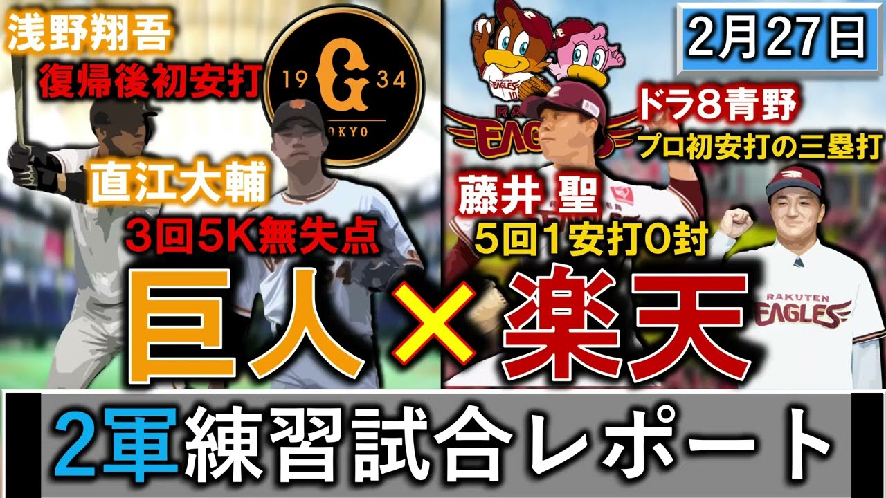 ではいそうですねまあまあ直江選手に関し てはね今日しっかりとこう投げれていたか なという風に思いますまランナーは脱出 やっぱこうたくさんね三振取れてファア ボールも出ていないというところを考えれ ばま上場の出来かなっていう風には思い ますし状態は良さそうではありますよねで ま前回のね2軍戦も18日かな投げており まして2ニングでダ三振4四90失点0と いうところでございますまあまあなんで 京都合わせると5イニングでダ三振9無視 点無視球とまま素晴らしいね結果が出て おりますまあまあなんでこう1軍に上げて あげたいなっていうところもあるんですが まあまあただやっぱね今んところは わりかしもう1軍のメツも固まってきてい るっていうところでありますしま当然こう 何がねねあるかわかんないんで老手候補で あることは間違いないんですがままただ やっぱこうタバ衛星っていうところもあり ますしなかなかその1軍に上がる タイミングもないのかなとまただやっぱね 1軍で少ないニング投げるよりまこうやっ て2軍でね長いニングどんどん投げてい くっていう方が今の代にはいいのかなって いう風に思いますしそこまで焦ることは ないのかなという風に思いますでま先発 ローテに関しても安倍さんは兼ねてからま 菅野選手の感覚を開けてま7人でねローテ 回そうかなっていう風に言っておりますま そうなればやっぱね彼の入ってくる隙って のも全然あるんじゃないかなという風に 思いますしま直上選手であったり横川選手 井上選手まあまあ他の選手もねたくさん いるという中でまこうやってしっかりと アピールし続けるってところはね大事なの かなという風には思いますんでまあまあ 今後もね教育リーグ等で投げるのかなって いう風に思いますがまちょっとこの状態の 嘘さはね楽しみではありますよねでこちら 見ていきましょう富士さんこれは結果だけ 見ると開幕ロで確定金ということではいで ま今日ね楽天の方も非常にピッチャー陣 良かったですま完封というところでござい ましてまどのピッチャーも良かったんです が5位ニングね無視点で抑えてくれた藤井 選手まこう楽天で言うとね先発ピッチャー ていうところこの辺がちょっとしんどい なっていうところはありますま去年の時点 でもしんどかったんですが松井選手がね 抜けて乗物選手が後ろに回ったっていう 事情がありますま去年1番イニングを投げ ていたのが能本選手っていうとこでござい ますからまその穴をどう埋めるかっていう ところは非常に大きいんですよねま