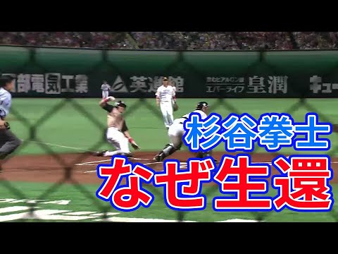 【パ・リーグ名場面プレイバック】2塁走者の杉谷拳士が驚愕の走塁を見せる。打球はショートに転がり、遊撃手の今宮健太が1塁に送球。送球したのを見た杉谷拳士が3塁を蹴って本塁へ向かうと、ブロックの隙間を縫って生還!! 一気に2塁から生還する驚愕の神走塁を披露し、1点をもぎ取った!!