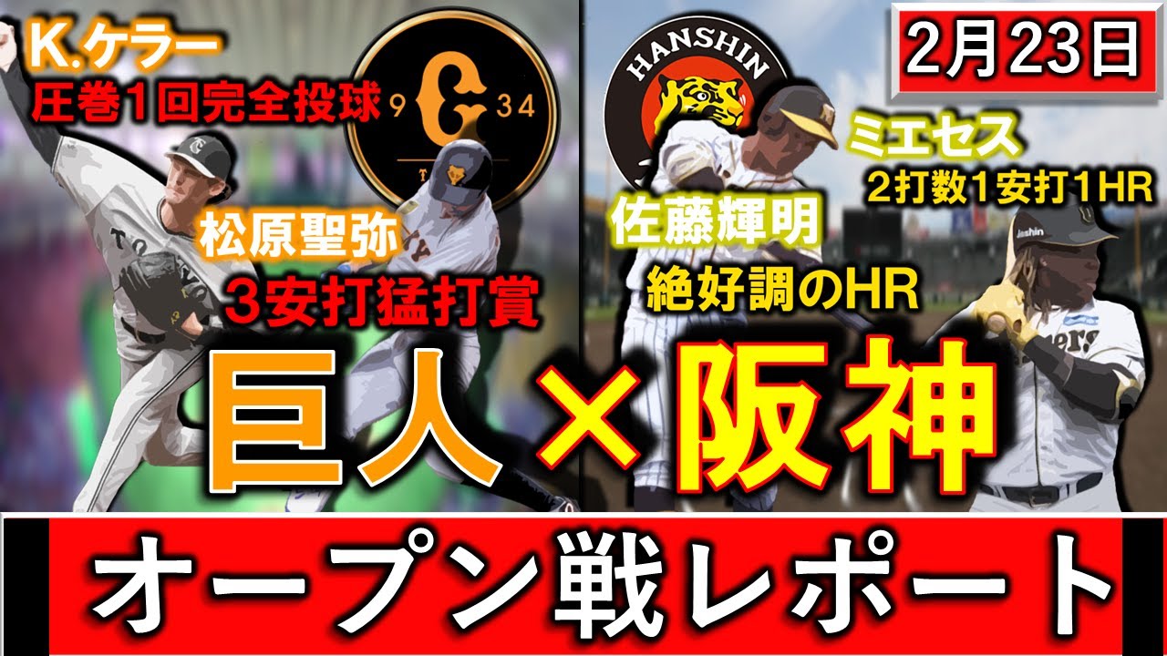 は思いましたまやっぱ巨人本当にね去年 こうなかなかリリーフが厳しいっていう ところはあったんですがまそこにこの ケラーが入ってくることによって色々ね 相場効果も生まれてくるんじゃないかなっ ていう風に思いますんでまこのままの状態 で開幕迎えて欲しいなという風に思います がでこちら見ていきましょうイマは何も 心配イランサトテルが調子良すぎてほんま に怖い昨年の村上くらい怖いわということ ではいで今日ね阪神はま伊藤正選手がね1 回まさかの7失点というところでござい ましたまちょっと驚きはあったんですが まあまあでもその後ねしっかり立ち直って 3回を投げいてくれくれましたま伊藤選手 に関してはね例年オープン戦は割と打たれ ているっていうところもありますしま やっぱこう南東派技工派のピッチャーは この時期ね割と合わせられやすいって ところもあるのかなままなんで正直特に 心配はいらないかなという風に思いますで 一方でバッターで言うとやっぱ佐藤照明 ですよね彼がま本当にずっと状態がいいと いうことになっておりますま年々ね1年目 2年目3年目と成績を右方上がりに上げて いる彼でございますま去年もですねWRC プで言うと150ぐらいね乗っております しまもうリーグでもね上位クラスの バッターかなっていう風に思いますまただ 本当に今年はね状態がかなりいいっていう ところもありますしま4年目の今シーズン さらに成長を見せるというところになれば ですねもう本当ねリーグでも1番2番を 争うくらいのバッターになってくれる可能 性もあるんじゃないかなという風に思い ますしまもしそうなればね阪神の2連覇ま ア連覇ですよねそれがより現実的になって くるんじゃないかなという風には思います ま今シーズンね大山選手がFA権職するっ ていうところもありますんでまよりね成し た姿っていうところが見れるんじゃないか なっていう期待がねどんどん高まってきて いる佐藤照明でございますがまあまあ本当 どこまで行ってくれるのかっていうところ 楽しみでしかないのかなという風には感じ ますがはいというわけで今日は以上です よければチャンネル登録コメント高評など いただければ嬉しいです野球人でござい ましたせのゲームセットありがとうござい ました