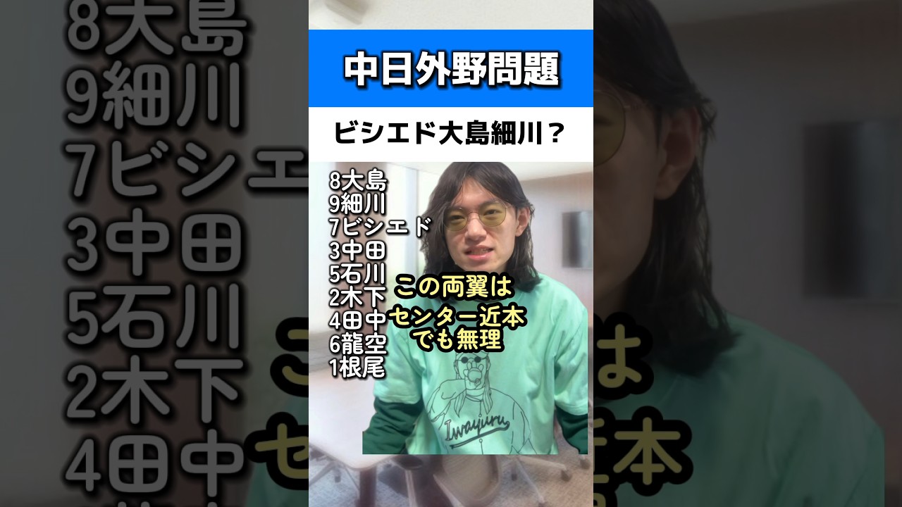レフトビシエドセンター大島ライト細川は おかしいだろうこれは強くなるな守備不安 でもセンター大島が何とかしてくれる でしょう大島今27歳だと思ってんのが この両行はセンター地元でも無理だろう 上林かブライトには荷が重いでしょ中日の センターは大島しかいない林使わないわけ ないだろベストないんだぞレフトもダトで おかしいしえじゃあレフト中田派言っとい てよその2択もおかしいだろ中田シが レフトはもう無理だろ中地がよくショート 時代にレフトの妥協をかけてギリギリで 譲ってたからレフトもできるなそんな理由 でやらせるかよそれで北京をオリンピック の時にgg佐藤のエラーが増えたんだから 誰が覚えてんだよ