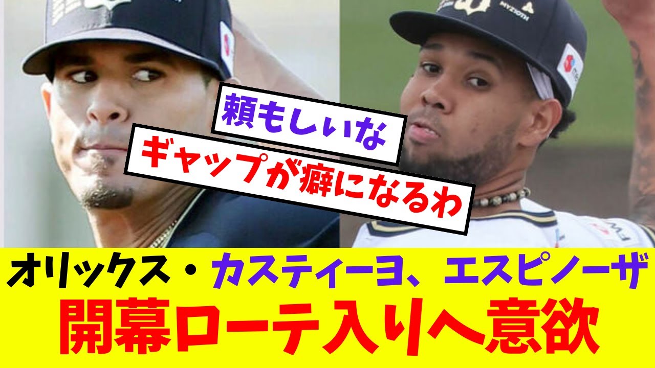 オリックスカスティーヨレスピノザ開幕 ローテリエ欲ロッテから加入した カスティーヨは作期3勝を上げ6回909 が自己ベスト1回から9回まで自分の中で しっかり投げ切りたい気持ちが強いその ための準備を今からしているとプロ初関東 を視野に調整を進めているエスピノサは 来日初実践だった24日の練習試合で DNA2分を相手に3者連続三振デビュー プレイするのが待ちきれないどんどん打者 に攻め込んでいって速やかにさっさと アウトを取っていきたいと力を込めた 頼もしいなこのパターンやろしはてなは 安倍まあたりかね先発ローテーション宮 山下田島東は確定あとは山岡佐をオープン 戦でテストカスティーヨエスピノサも結果 出せばシーズンでは投げ真勝で器用かな ペータ中ろがちょっと心配やな今年ペータ が中ろできなかったら25歳すのは厳しく なるだろな中で回ること自体はできると 思うんやけど佐々木と同じで出力に身体が 耐えられるかどうかなよなペーターズはバ 降スタミナが持つかどうか宮城が起きて くれてほんまに良かったな3年連続先発 ローテ感想しとる安心感たるや宮城が ロッテにいたらロッテが3連覇してそう 宮城がロッテに行っていたとしてロテが 優勝したかはわからんけど連覇はなかった やろなは契約かもらの原石やと思ってたが 思いの他すでに光り始めてる原石やんな SPは下がり眉が何とも見ているこちらに 不安感を与えるやが弾はしっかりしとって そのギャップがくせになる [音楽] わ