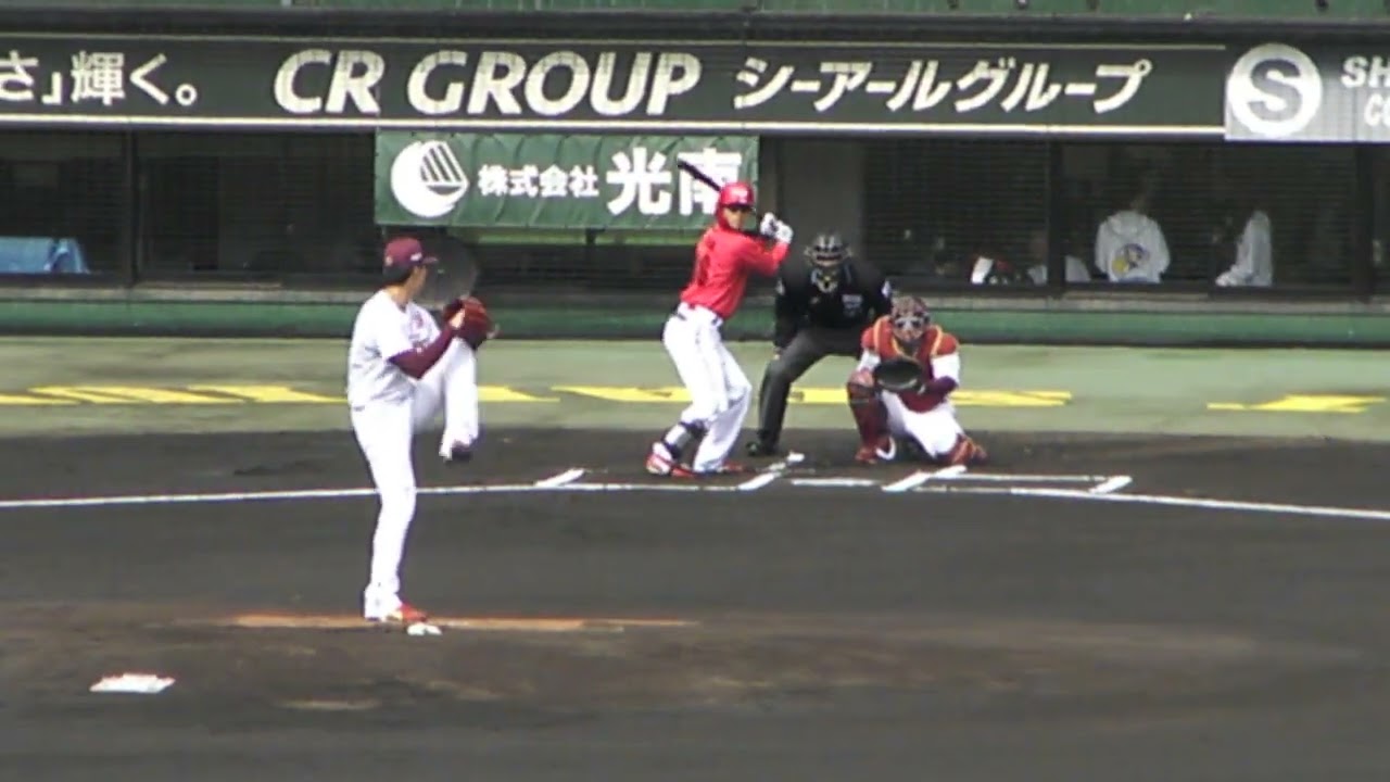 2024年オープン戦、東北楽天ゴールデンイーグルス VS 広島東洋カープ@倉敷マスカットスタジアムでの広島カープ 宇草 孔基のバッティングフォームです。(遠くからの撮影でブレが大きめです。すみません。)