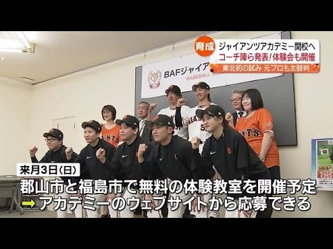 し4月から郡山市と福島市で開するのは プロ野球読売巨人軍が作った育成メゾット を使って子供たちに野球の技術や楽しさを 教えるジャイアンツアカデミーです ジャイアンツアカデミーは東北初の試みで 幼児から小学6年生までを対象に年齢に 合わせた4つのコースが用意されています 今日はスクールの練習プログラムや携わる 高知人からの発表会が行われ元プロ野球 選手の伊藤カさんも応援に駆けつけました ジャイアンツを地方でやるっていうことは 結構斬新でしたのでそれを一番最初に福島 でできることは本当にすごいことだなと 思いますで子供たちも心から野球楽しいな と思ってもらもっと身近なものに感じて もらえるような取り組みをしていきたいと 思っており ます スクールの開校を前に来月3日には郡山市 と福島市で無料の体験教室が開かれる予定 でアカデミーのウェブサイトから応募でき ます
