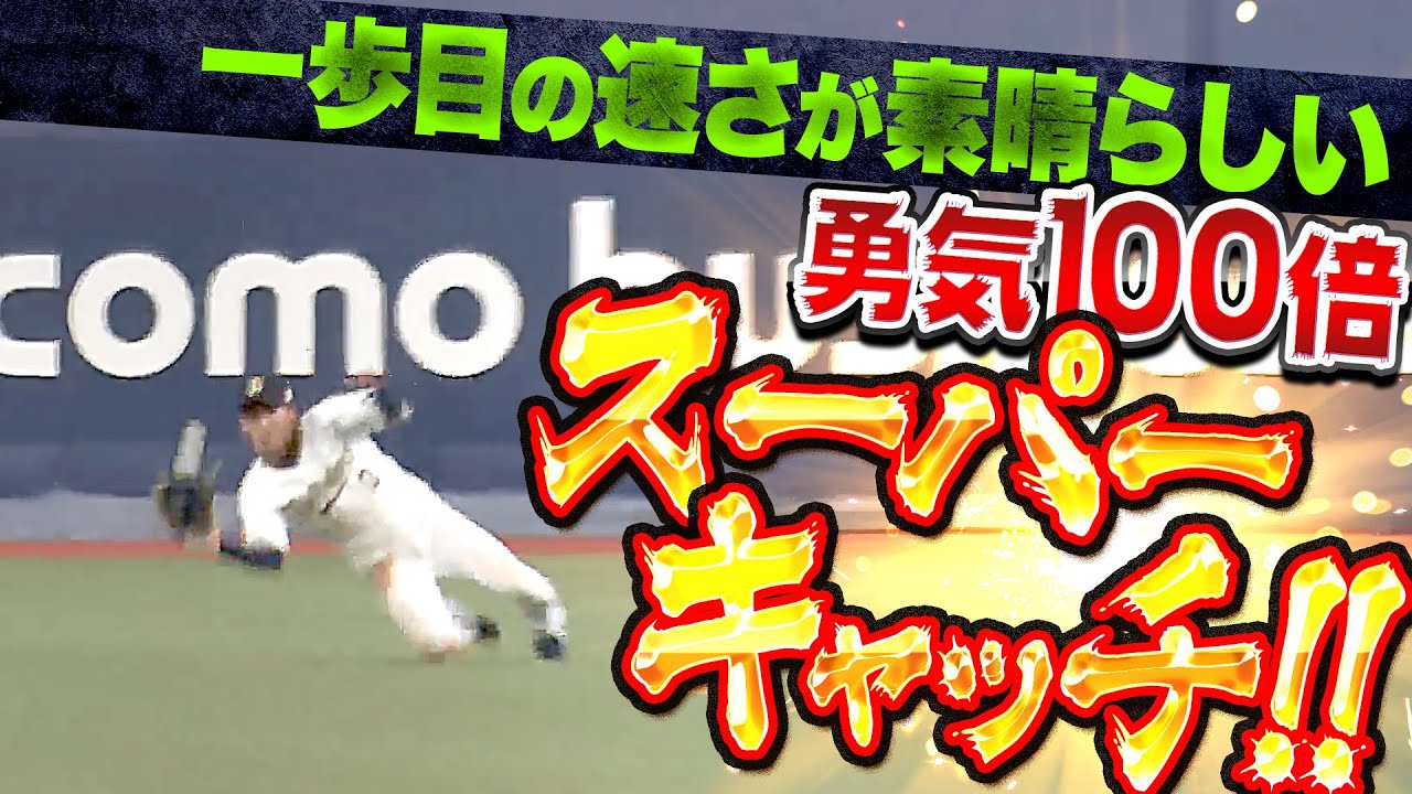 左打者の切れていく難しい打球も、オリックス・渡部遼人が一直線に前進してダイビングキャッチ!! 一歩目の速さ、打球の判断が素晴らしく、勇気100倍のスーパーキャッチを披露した!!