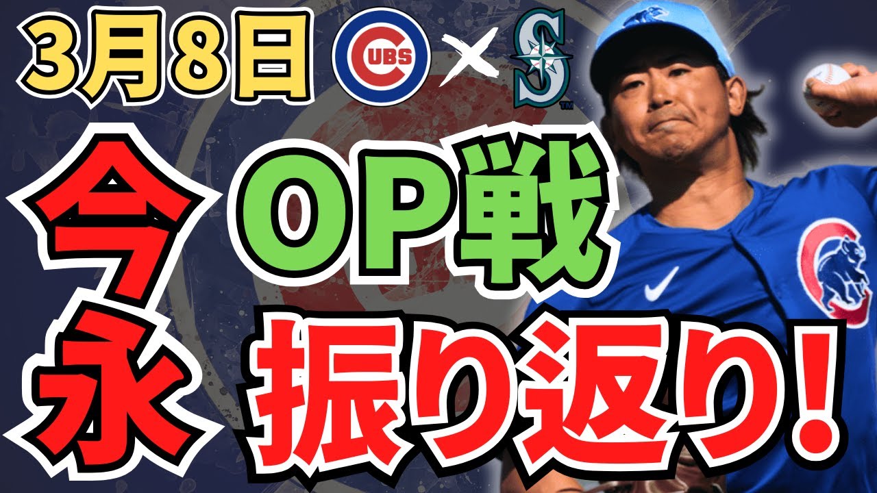 高株ス号お世話になっています株門です3 月8日に今なが翔太投手がシアトル マリナーズを相手にメジャー移籍後2度目 の先発に挑みました前回登板は ロサンゼルスドジャースを相手に2回13 3失点牛95奪三振の投球結果でした前回 は三振を多く奪えましたたが定日にレフト スタンドへ3ランホームランを打たれて しまいました今なが投手はNPB時代で本 ダーが多くパワーヒッターが多いメジャー で同課題を克服するかが大事になってき ます後矢選手との初共演になるので注目 です鈴木星也選手がどう今長を援護したか 見てみましょう今長の投球内容について ですが3回4アダ 29.5脱三振でした今回の課題は コントロールでした少しアバウトで ストレートの逆玉も多くチェンジアップも 少し浮いていましたポ要素としてはカット 玉が要求通りに多く投げれてカウント玉と して使うことができました試合後の インタビューで今なが投手は今日の試合は ストレートを高めに投げてカウントを稼ぐ ことを目標にしていたがボールになったり ファールを取れても決める時に抜けたり カウント作れないママボール先行になって 避弾したりしたので前回と同じ失敗をして しまったとコメントしていました次の登板 でどうかを克服するか注目ですそして鈴木 星矢選手の打撃成績ですが3打数ミアンダ 1打点でした1打席目はレフト前2打席目 はバットを降りながらもライト前への タイムリー3打席目はファールフライでし た今日は珍しくレフトを守っていましたが 守備機会はほぼほぼありませんでした日本 人コンビの初共演で鈴木星也選手が今なが 投手を援護するタイムリーを打つことが できました他の選手の活躍で言うとシが タイムリーと2ランホームランクーパーが 3ランホームランを打ちましたアト ベリンジャーがオープン戦の初ヒットを 打ちましたということで本日の動画は以上 となります今後もシカゴカブス関連の情報 を発信していきますので少しでも興味が ある方はチャンネル登録をお願いします 動画投稿を続ける最大の持ちになるので コメントもお願いしますご視聴ありがとう ございました OG
