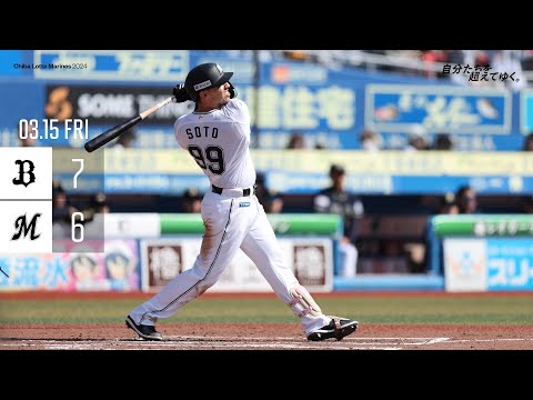 打った瞬間はねま若干先だったかなって いう印象ですねはい勢フライで1点を返し ましたさらにはこのフランコの強烈な 当たりこれはファーストのエラーとなり ましたけれどもさらにこれで1点を返して 5対5の同点と追いつきました4回の裏 ですそして6回の表 バファローズはノーアウトから セーニョまこの回は鈴木がマウンドに5回 6回と上がったわけですけれどもアウト6 つは全てゴラアウトでした今日の鈴木と いうのもいいピッチングでしたねま 引き続きストレートねしっかりオープン戦 含めてキャンプからね切れてるんじゃない ですかねはい非常にいいストレートと そして打たせて取るピッチングで2回を無 に鈴木翔太抑えましたいいアピールを見せ てい ます [音楽] 7回の裏は今シーズンから育成加の井口が マウンドに上がりました フレズ荻野がしっかりと初球を捉えてネト 前 ヒットそしてランナー2塁2アウトの状態 で安田のこのバッティングバットの ちょっと先ではありましたけれどもアウト コースのボールしっかりと弾き返しました まとしてはねいい形態になりましたねを 勝ち越したバロッテマリーンズ ですしかし9回でしたこの回マウンドに 上がった吉田1アウトランナー2塁1塁で T岡田まはうまく救われたような バッティングですかねそうす ね6対6の同点となるT岡のタイムリー ベテランがアピールをしまし たさらには満塁となりまして中出の 石川ここは犠牲フライ最低限の仕事をした ということになりましたこれが勝ち越し 逆転のタイムリーとなっ たオリックスバファローズの石川7対6と し ますそして9回の裏は横山がマウンドに 上がって最後は安田が見逃しの三振で 終わるという形になりましたランナー3塁 まで進めたんですけれども最後は結果残せ ずということになりました7対6で オリックスバファローズが勝利ということ になっていますこのパサルパシフィック リーグオープン戦です