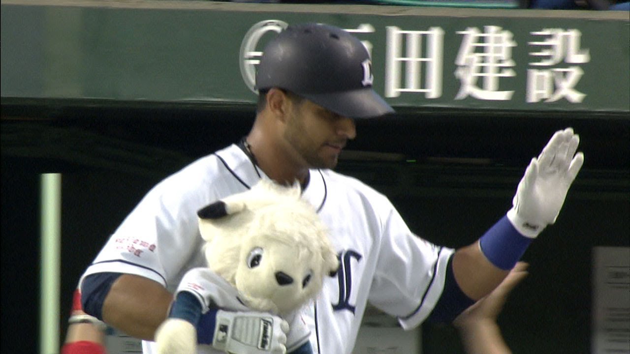 2回、先頭のメヒアが4号ソロホームラン。この一発で、埼玉西武が先制。田辺監督代行となってのホーム初戦で、チームに勝利をもたらす一発となるか。 (6月12日 埼玉西武-広島)