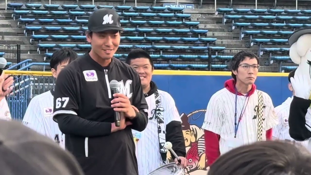 さんここでスペシャルゲストが来てくれ てるということで早速ご紹したいと思い ます皆さん大きな拍手でお迎えください まずは1人目 [拍手] [音楽] [拍手] [音楽] [拍手] [音楽] どすさあそれではもう1人お呼びしたいと 思いますもう1人いますということで2人 目は ナンバ 67 [音楽] [拍手] [音楽] はいお来ていきました皆さん改めてえご 紹介しましょうまずは杉選手そして選手来 ていただきまし たえちょっと挨拶いきたいんですけどどう ですか このね方が集まってると思ってなかったん でえすごいありがたく感じます あのお聞いてますか結構やっぱ聞こえてき ますか社中はそうですねこう今日たくさん の方来ていただいたんでえすごい聞こえ ましたありがとうございますで今日はね風 も強かったですけどナイスプレ2つもあり ましたよねどうでした風はそうですね風が 一番怖いん で頑張りましたはいえまず友選手です ありがとうございますそしてえもねえご 紹介させていただきます茶谷選手ですチ 選手ご [拍手] 挨拶とても嬉しい ですえっと大はお気に入りの選手の他の 選手の記憶とかあります かあ角中さんとかすごいい聞いてますか 結構耳に残ってますかはいはいじゃそんな 茶手が来てくれたわけがあるんですよと いうことでちょっとこれからその話に移っ ていきたいと思いますけれどもえお2人 新しい応援化がてきまし [拍手] たえ応援ができたというところでどんなお 気持ちかまず友杉選手から聞いてみたいん ですけどやっぱマリンズにおいて大ができ るってことはやっぱり特別ですよねどう でしょうそうですね2年目のすぐに作って いただけると思ってなかったんですごい 嬉しいです 田選手はどうでしょう自分もよそから移籍