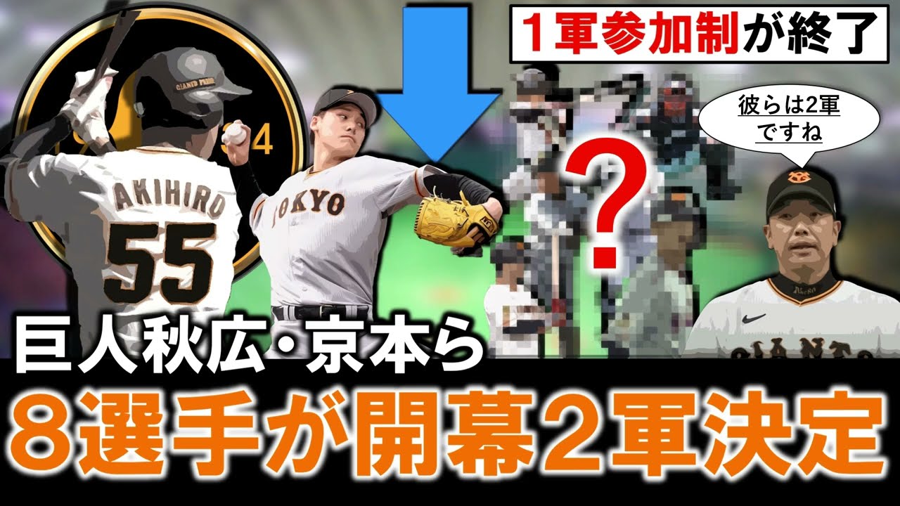 ず苦しんでいるっていうのは見て分かり ますんで今はねそういうところでグっと 耐える時期なのかなという風には思います やはりこう2mを超えるヤシっていう ところNPB日本人の例はねほとんどない というところでございますんでそういう 意味でも特別な選手でございますクって いうのもね人1倍するのかなっていう風に は思いますがただやっぱ彼が物になった時 のリターンていうのは測り知れないんで 今回は2軍というところでありますが個人 的には期待しかしてない選手なんでここ からこう巻き返して欲しいなというところ でございますがで一方こちら見ていき ましょう岩長田の2軍差と確定となると if内ですねのサブが出口だけになるけど 大丈夫なんということで今回秋色選手が 開幕2軍というとこでございますがそれ 以外に7選手K8選手が2軍スタートと いうところでございますでキャッチャーが ね1軍は大城小林氷がね保守3人っていう ところで決まりましたで一方内野で見て いくとこのまま行けばですね岡本坂本吉川 門脇出口この5人しか今現状いないんです よねなのでめちゃめちゃね内野が少ないと いうことになっておりますでそれで言うと コ選手がある程度内ねできるっていう ところがあるで小ドアも行って海谷選手と か萩尾選手らもファースの練習している らしいんですがただショートがですねい ないんですよね実は今んところ守れるのは 門脇選手と出口選手のみ本選手も守れるん ですがただまさすがにというところであり ますなのでこの夫人であれば出口選手が セカンドでこう開幕さめもあるんじゃない かなっていう風に言われているんですけど それをしてしまうとショートの控っていう のがいなくなるんですよねなんで結構ね 動きにくくなるんじゃないかというところ であるんで個人的にはね誰かしらもう1人 ショート守れる選手上げてきてもいいん じゃないかなという風には思いますがただ ねまだ開幕まであるので誰かしたらまた気 が変わって上がってくる可能性もあります しその辺は何ともなっていうとこであるん ですですがちょっとね1軍メンバー見て 外野がかなり多くて内野が少ない特に ショート守れる選手が少ないんでちょっと まその辺の動きは注目かなっていう風に 思いますがはいというわけで今日は以上 ですよければチャンネル登録コメント高 評価などいただければ嬉しいです野球人で ございましたせのゲームセットありがとう ございまし た