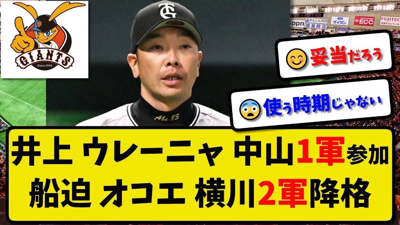 [音楽] 井上ウニ中山1分参加船様を声横側2分攻 巨人の安倍監督は試合後外 船手横川街主の3人を2軍に攻させると 名言した変わって19日のオープン線ロテ 線から井上ハフト投手中山ライトないと 育成のエスタにャが1軍参加するおちは 妥当だろういつも通りもたいねいい感じ だったのに分丸に戻っちゃったわお声は 瞬間的な爆発力あるけど長続きしない1位 任務79で終わらせた横川さん落ちる横川 は先発離脱とかしたら交代12番手って どこでしょう横川は結果残したから次の 待機先発枠で2軍で長いイニング投げ させるんだと思う船場様が勝ちに入って くるかと思いき山坂の2軍船場様はなんか コントロールアバウト過ぎてなんだかな 去年のリリーフ人ほとんどいなくなっ ちゃったプレにャはまだ諦められんのか ウレーニャでクモを使う時期じゃないやろ ウレーニャに期待してるのこの地球上で 安倍さんだけだよな井上は1回見ておくん かな井上は頑張って先発予備軍の順位を1 つでもあげてくれ井上はまず1軍での配線 処理を通過せといけんからな中山は内人 休ませ要因なんじゃないのか中山2分で 良いところなかったのに一応チャンス もらえるんだな中山にとっては大きな そして数少ないチャンスだろうで ご視聴ありがとうございました話題の野球 情報をお届けしていますのでチャンネル 登録をよろしくお願いし [音楽] ます