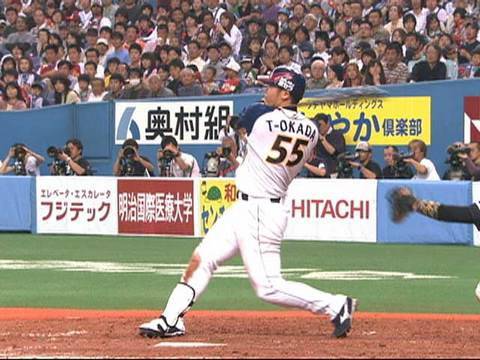 カブレラが三振で倒れた後、走者1,3塁でT-岡田の打席。高めのボール球をライトに悠々と運んでオリックスが3点先制。(2010年5月5日 オリックス・バファローズ対福岡ソフトバンクホークス)