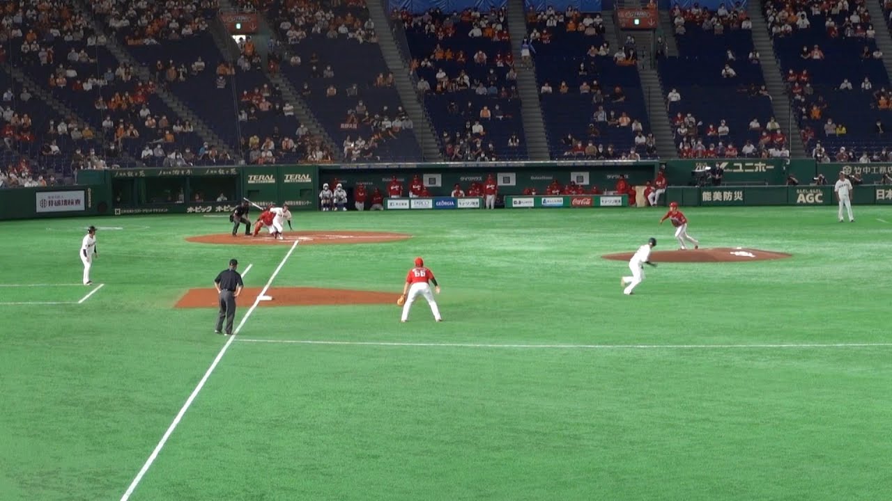 0-0で迎えた3回の裏、広島カープの先発遠藤から、カウント3-2と粘ってライトへクリーンヒットで走者二人生還!先発菅野の開幕12連勝へ大きな援護!