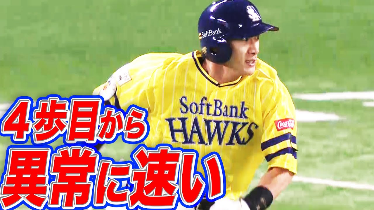 フワリと浮いた打球がはずんだのを確認した福岡ソフトバンク・柳田悠岐。そこまではゆったりと走っていたが、打球が落ちたのを確認し急加速。ギアチェンジから2塁到達までが異常に速い!!