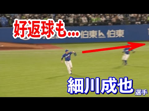 【好返球も…】ライト細川成也選手がバックホームでいいボールを返すもリクエストの結果セーフに。2024/03/29