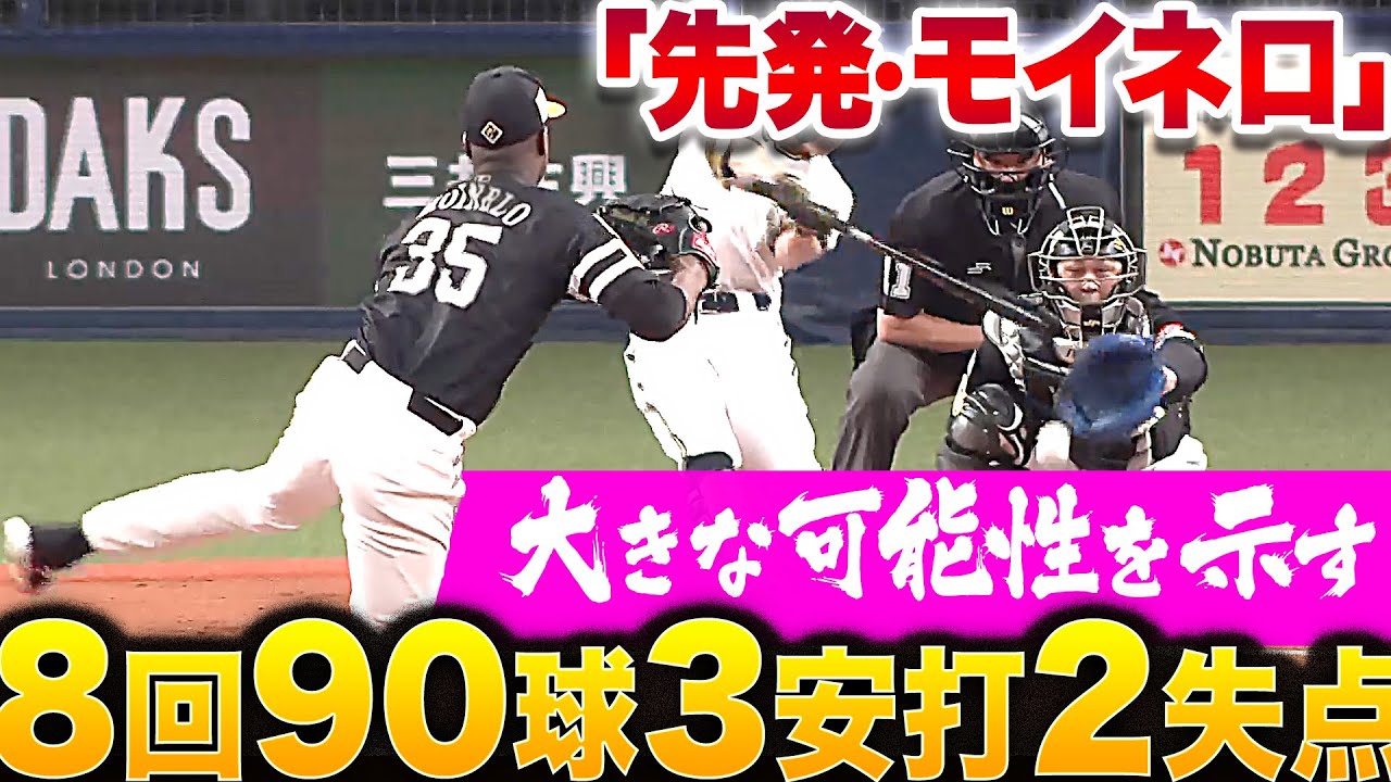 攻撃が長く続き、4回まで完璧投球。ペース配分も上々で球数も少なく、緩急自在。5回に失点するも、以降は許さず。8回90球を投げ、被安打3、2失点の投球。先発の可能性は十分に示した、福岡ソフトバンク・モイネロの投球をお届け。
