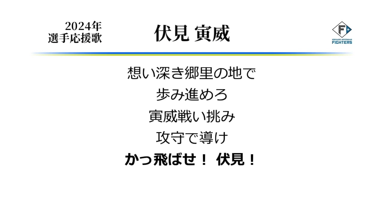 伏見選手の日本ハム移籍後の応援歌です。 日本ハム球団公式HP上の歌詞表記が「想い」ではなく「思い」なのは誤植でしょうか。 この動画を見ている球団関係者の方がいらしたらぜひ直してほしいです。 ○伏見応援歌(オリックス時代)→https://youtu.be/GUdAqVMUB3c N n Hokkaido Nippon-Ham Fighters (Baseball Team)ORIX BuffaloesTorai Fushimi (Baseball Player)オリックス・バファローズなんぶふじ伏見寅威北海道日本ハムファイターズ応援歌 NPBHUB.COM | The Fanbase of Nippon Baseball & Nippon Professional Baseball