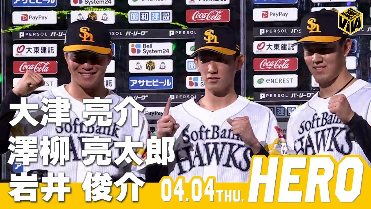 放送席放送席それではヒーロー インタビューです見事なプロ初先発そして 今シーズンの初勝利を上げました津介投手 ですおめでとうございますありがとう ござい ます先発デビューを終えて今のお気持ち 率直にいかがでしょうかそうですね ようやくスタートしたなと思って ますまそのデビューのが地元の福岡で そしてこの本拠地開幕カードという 巡り合わせにもなりましたしまさらナンド に大感性の中上がる気分はいかがでしたか いや本当最高な気持ちでバンドに上がり まし た緊張感とかそういったものいかがでした もちろん緊張感もありましたけど普段通り に投げれまし た内容を見ても6回を投げて無で1点しっ たんじゃないですかそうですねまヒットも 多く打たれたんでそこはちょっと悔しいな と思って ます打線もすごく答えてくれましたねいや 本当打線の援護があってからこその ピッチングだったんで本当感謝したい ですこれで2カード連続の勝ち越しという ところの大きな言動力になりましたその点 は先発としはいかがでしょうか本当そこも 意識してたんでしっかり結果で示せたんで 良かった です次はまた期待がより高まるそんな登板 になると思います最後にまた意気込みお 願いいたしますはいえ次の登板も自分 らしく全力で投球します応援よろしくお 願いしますありがとうございましたまずは 先発デビューを果たしました大津介投手に 伺いまし たさあ続いては初登板のお2人に伺って いくことになりますまずはドラフトゴル 澤柳両太郎投手ですデビュおめでとう ございますありがとうござい ますそチクに気分いかがでしょうかえっと そうですねま初めての登板で緊張したん ですけどえファンの皆様の応援のおかげで えいいピッチングでいきましたありがとう ござい ますそしてこのインタビューという機会も 初めてになると思いますがそこはどう でしょうかそうですねあの登板より ちょっと緊張してるんですけどはいうまく いけたらいいなと思い ますあの昨日はピッチャー多く使う展開に なってそして今日はというところはある 程度心づもりしているところありましたか そうですねあの多分行くなとは思ったんで はい最高の準備ができたかなと思い