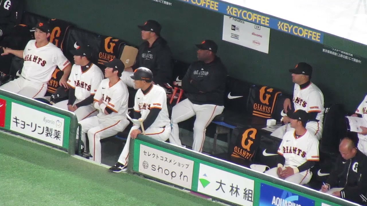 巨人守備中のベンチ 小林誠司や松原聖弥 重信慎之介といった選手たち<読売ジャイアンツ対 楽天イーグルス 2024年3月23日>