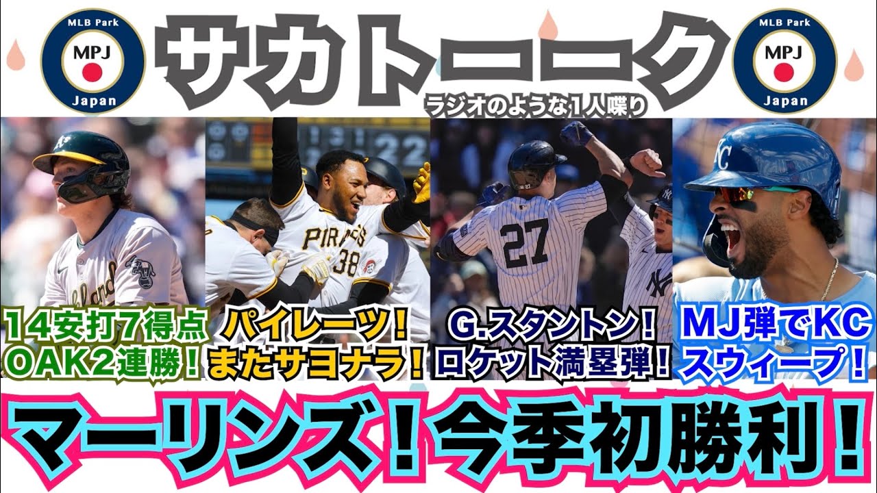 【11/162】祝マーリンズ初勝利!パイレーツは2試合連続サヨナラ!G.スタントンのロケット満塁弾!MJ弾でロイヤルズは4連勝!アスレチックスは14安打7得点で2連勝!