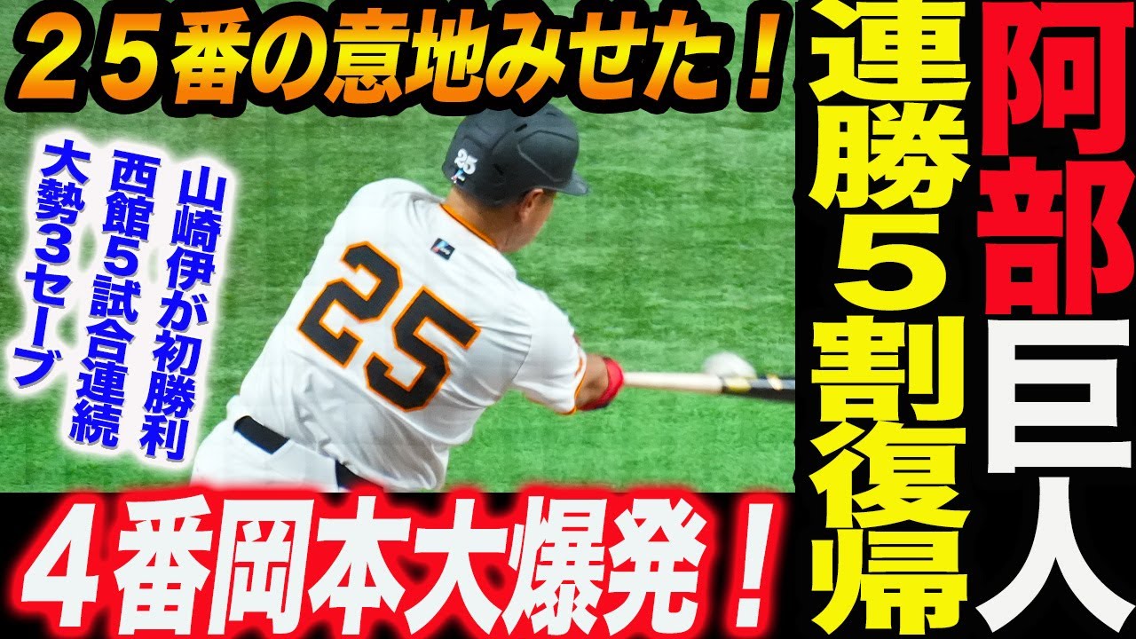 阿部巨人連勝で5割復帰!4番の岡本が大爆発!筒香合流前に25番の意地みせた!山崎伊が初勝利!西館5試合連続無失点!大勢3セーブ読売巨人軍 ジャイアンツ 巨人 GIANTS阿部監督