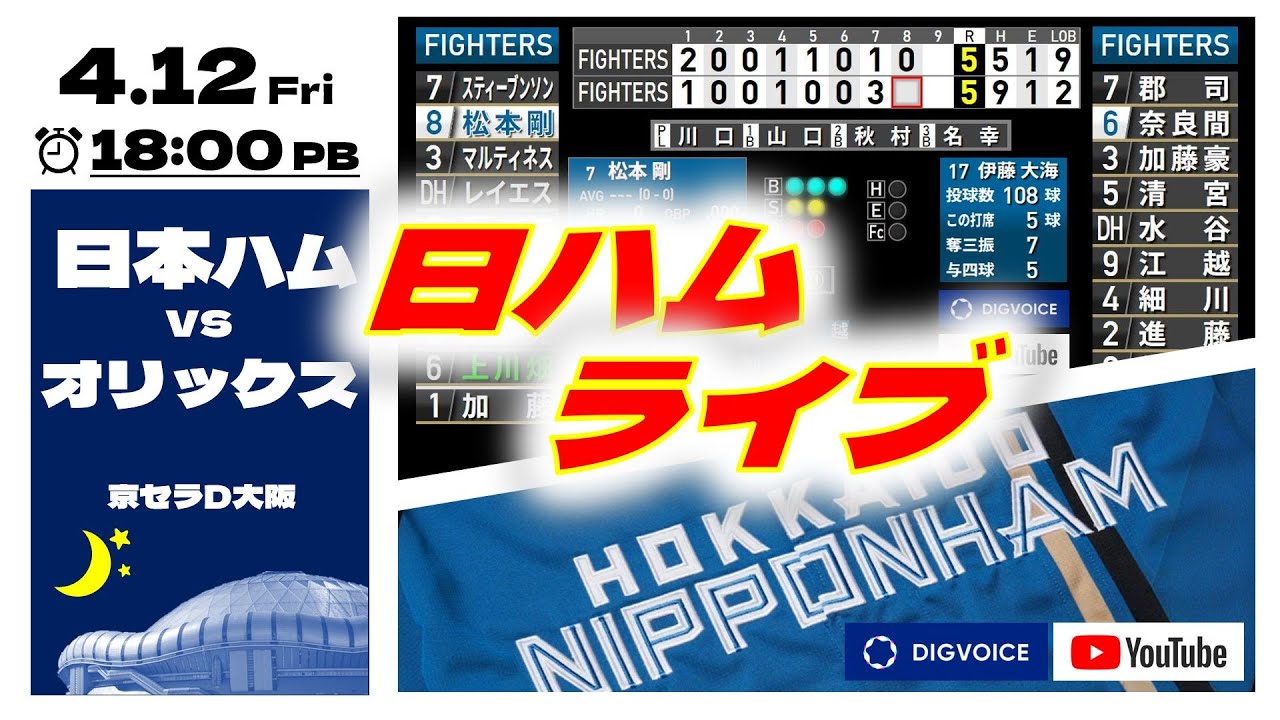 【日ハムライブ】2024年4月12日 北海道日本ハムファイターズ vs オリックスバファローズ @京セラドーム大阪  データ解説実況ライブ