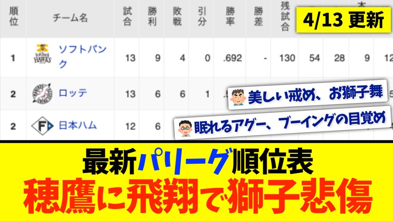 【4月13日】最新パリーグ順位表〜穂鷹に飛翔で獅子悲傷〜 ◆WBC映画『憧れを超えた侍たち 世界一への記録』 https://amzn.to/3NxMEJf #パーソルパリーグTV #パシフィックリーグ #プロ野球ニュース #なんJ #ハイライト #福岡ソフトバンクホークス #東北楽天ゴールデンイーグルス #オリックスバファローズ #埼玉西武ライオンズ #北海道日本ハムファイターズ #千葉ロッテマリーンズ #5ch #なんJ #2ch #まとめ #2ch反応 2ch2ch反応5chChiba Lotte Marinesオリックスセ・リーグソフトバンクなんGなんJなんJベースボールchなんJ野球王パ・リーグプロ野球ニュースプロ野球報道すてぇしょんまとめメジャーリーグようこそ野球さん千葉ロッテマリーンズ大谷翔平巨人日本ハムファイターズ楽天イーグルス西武ライオンズ野球阪神タイガース NPBHUB.COM | The Fanbase of Nippon Baseball & Nippon Professional Baseball