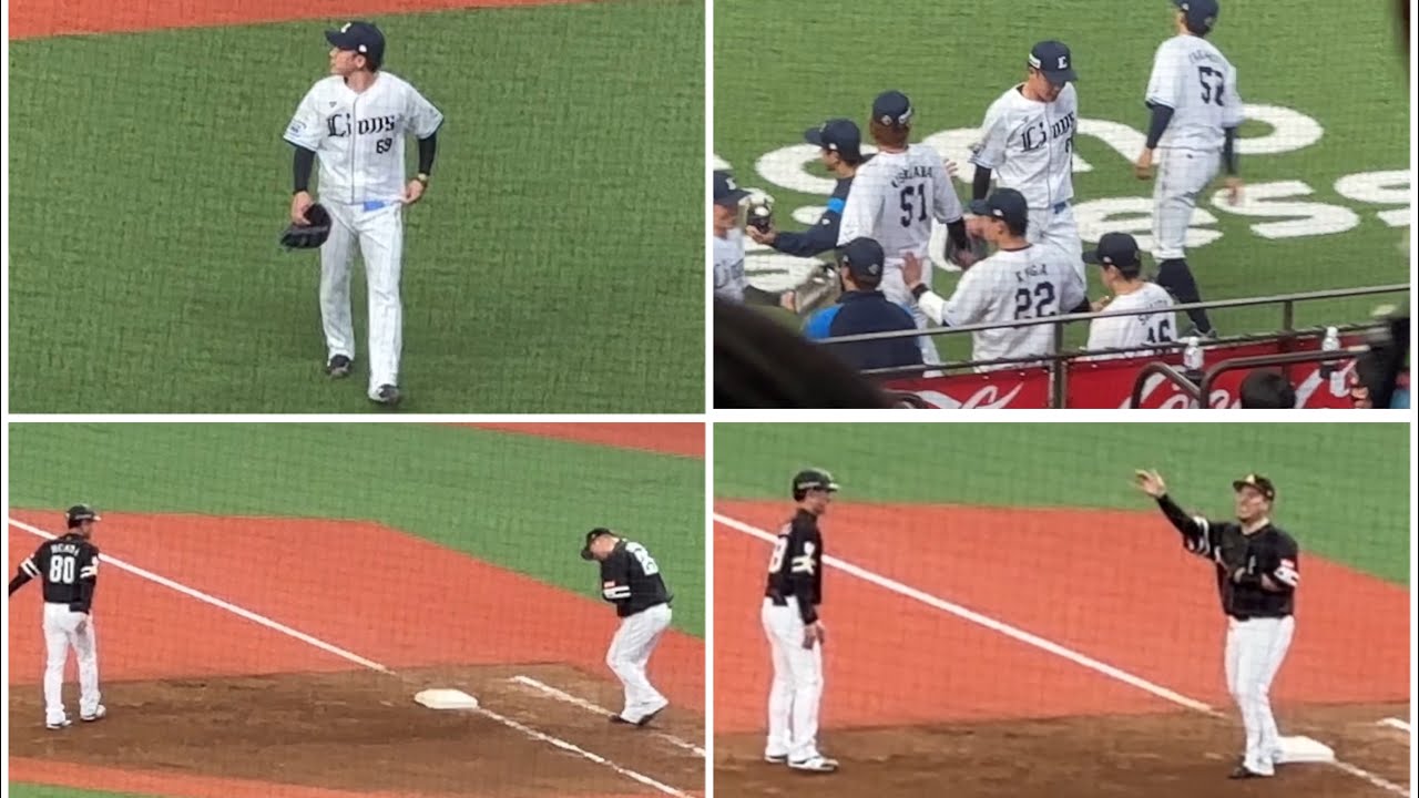 【満塁ホームラン】意気消沈気味にマウンドを降りる水上由伸と、意気揚々と守備につく山川穂高【西武2-11ソフトバンク】2024/4/13