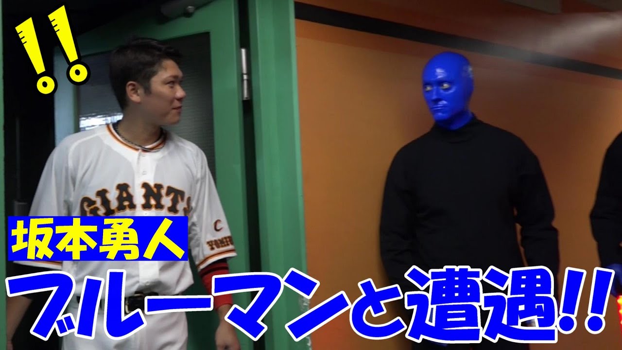 4月19日の試合前。独創的なパフォーマンスを世界で展開するブルーマンが始球式を務めました。元木大介ヘッドコーチや坂本勇人選手が出番を待つブルーマンと遭遇!