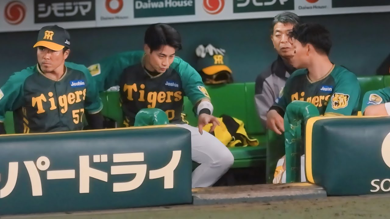【こう来るイメージ】相手投手の独特な球筋についてジェスチャーを交えながら何度も森下に伝える木浪 2024.4.17