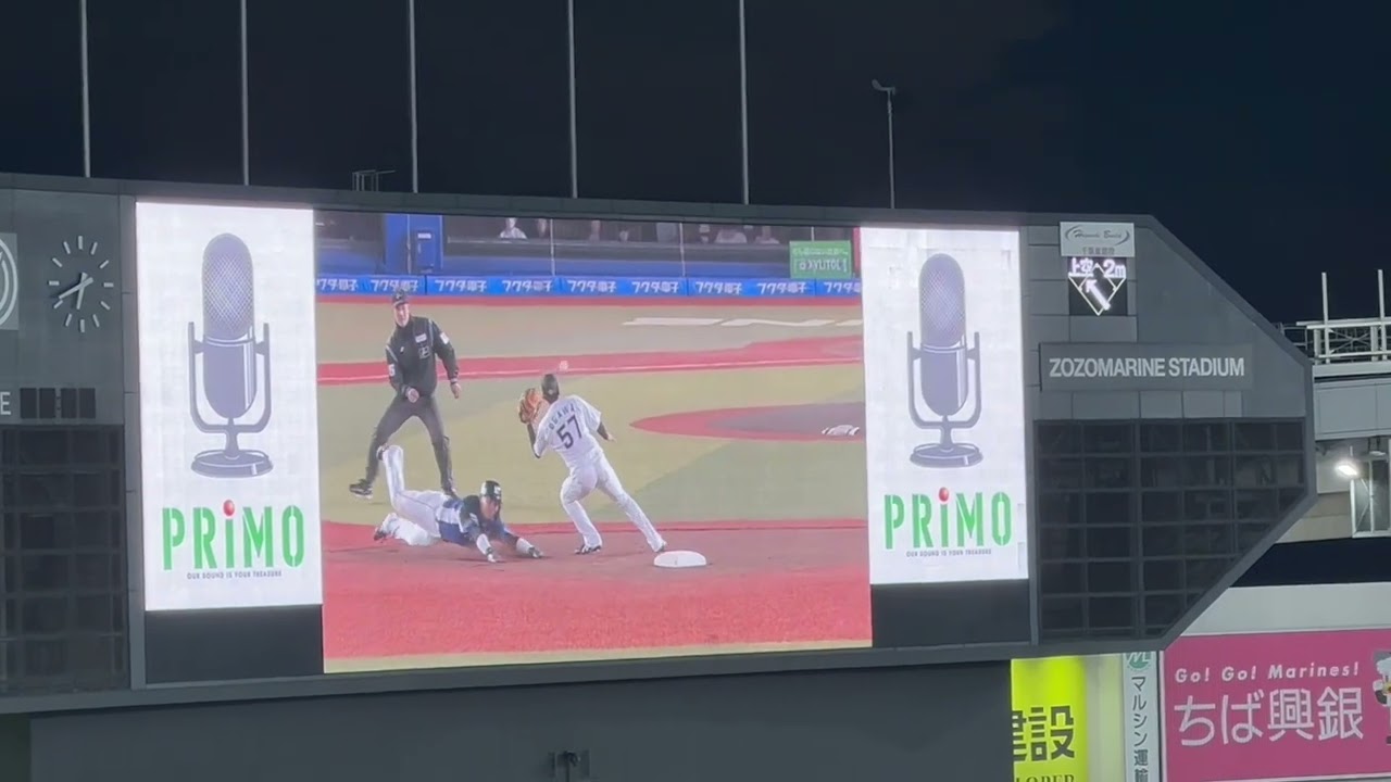 2024年4月17日のZOZOマリンスタジアムでのロッテvs西武での長谷川信哉選手の二塁への盗塁アウトに対するリクエストのシーンです。