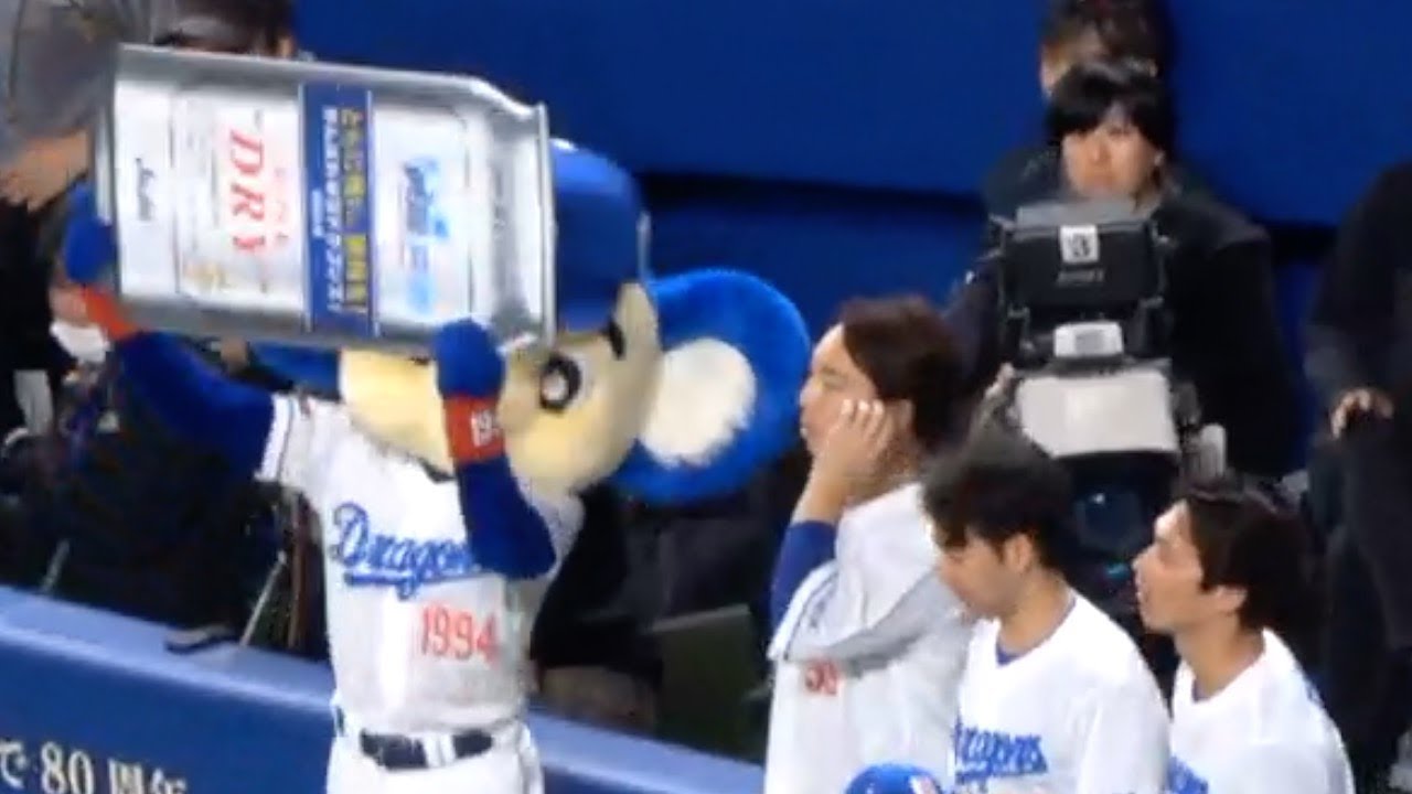 ドアラ 国歌演奏で宇佐見真吾にビールかけをする 中日ドラゴンズVS阪神タイガース 2024/04/13
