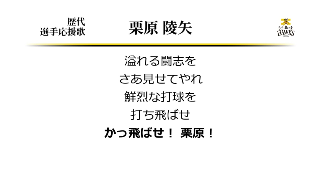 福岡ソフトバンクホークス 栗原陵矢 応援歌 (’15作) [MIDI] ソフトバンク栗原選手の旧応援歌です。大野隆治(大野立詞)流用。 応援歌の絶対数が多いホークスにおいては、とりあえず流用曲を当てておいて、 選手が成長した時点で必要に応じ新曲を作り直す流れも悪くないと思うのですが。 Fukuoka SoftBank HawksFukuoka SoftBank Hawks (Baseball Team)Ryoya Kurihara (Baseball Player)なんぶふじ応援歌栗原陵矢福岡ソフトバンクホークス NPBHUB.COM | The Fanbase of Nippon Baseball & Nippon Professional Baseball