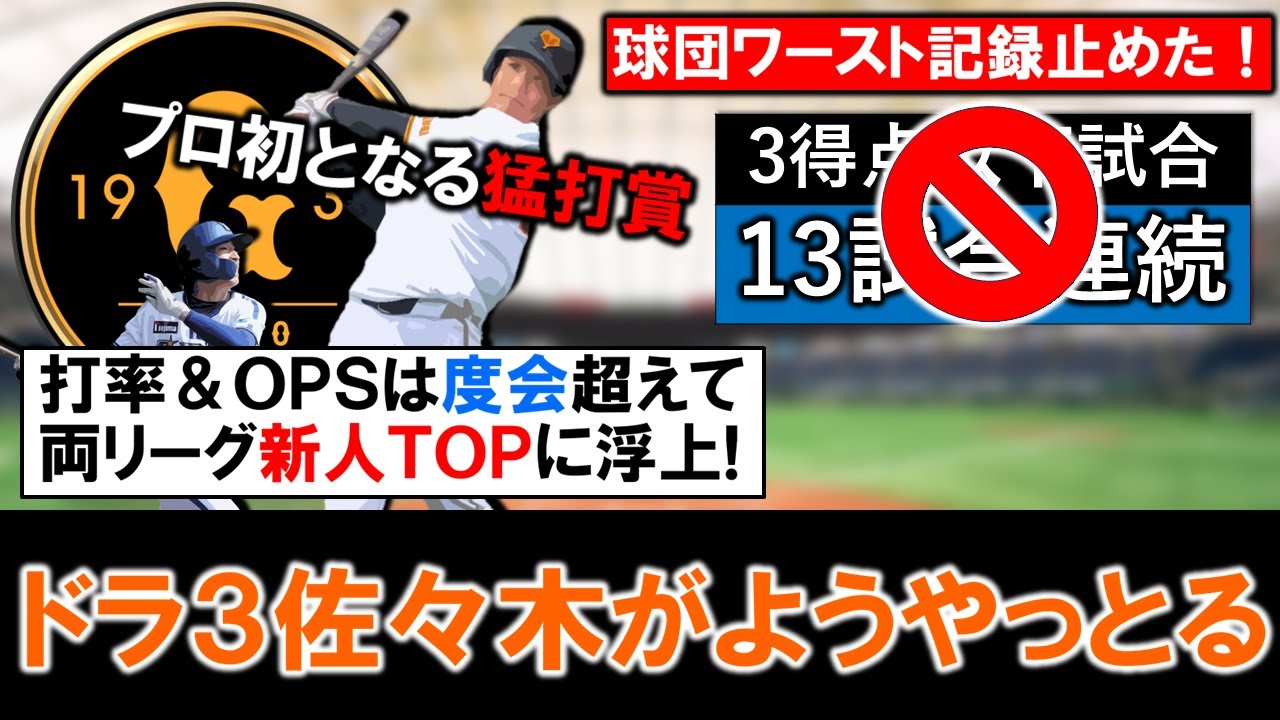 【ホントようやっとる】巨人ドラフト3位ルーキー『佐々木俊輔』がプロ初となる猛打賞で13試合連続3得点以下の球団ワースト記録ストップに貢献!さらに打率&OPSは度会隆輝超えて両リーグ新人TOPに浮上!!