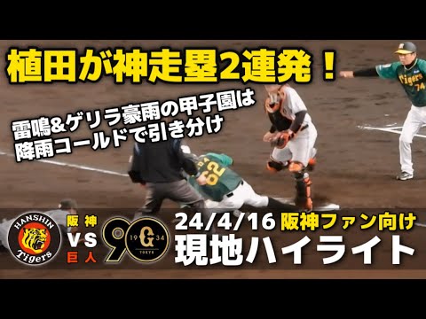 【現地ハイライト】2024.4.16 代走・植田が神走塁連発!奇跡の生還で同点に持ち込むも雷鳴響く甲子園は延長突入前に降雨コールドで引き分けに【阪神 vs 巨人】